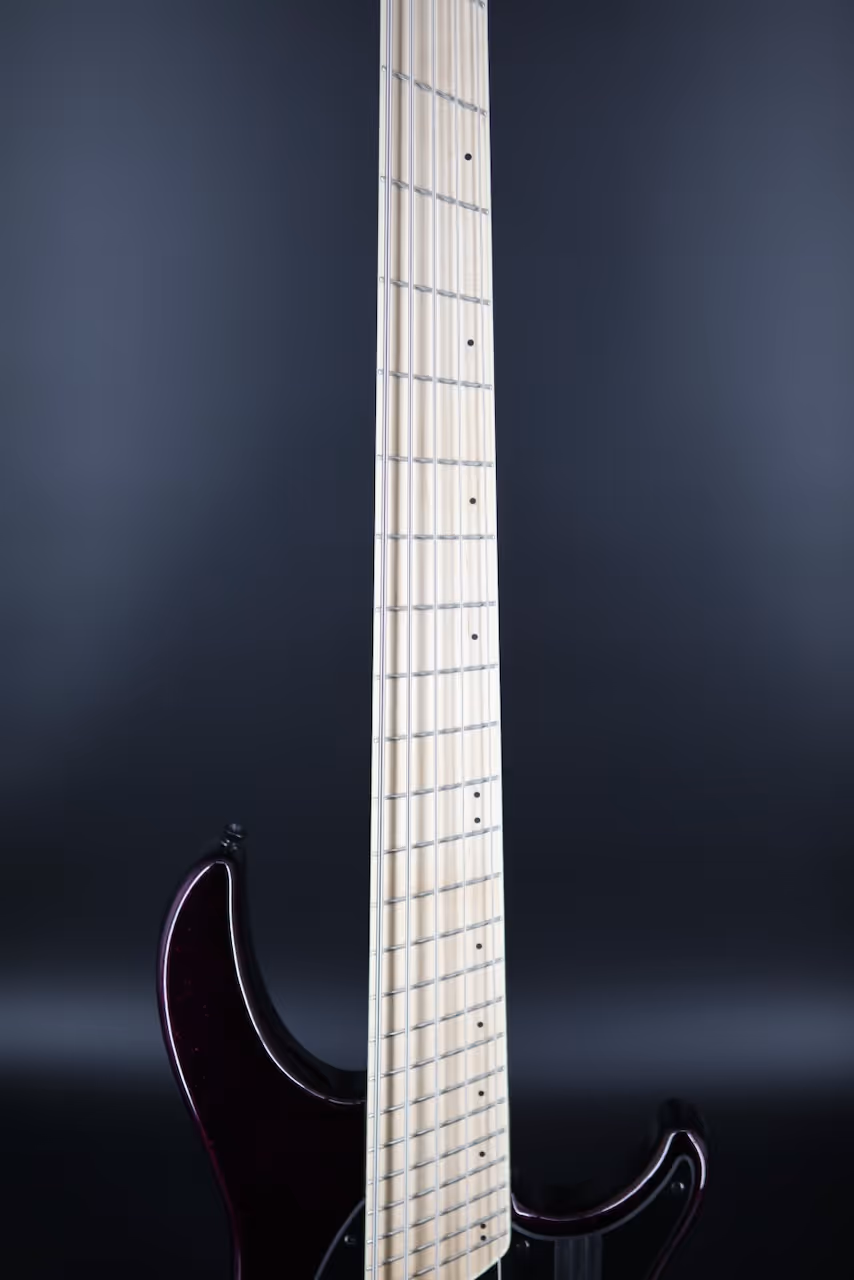Maple has a nice snappy top end that really enhances the attack of the note. We now finish our maple fingerboards with satin polyurethane. To maintain stability, we also finish the neck shaft with the same finish.