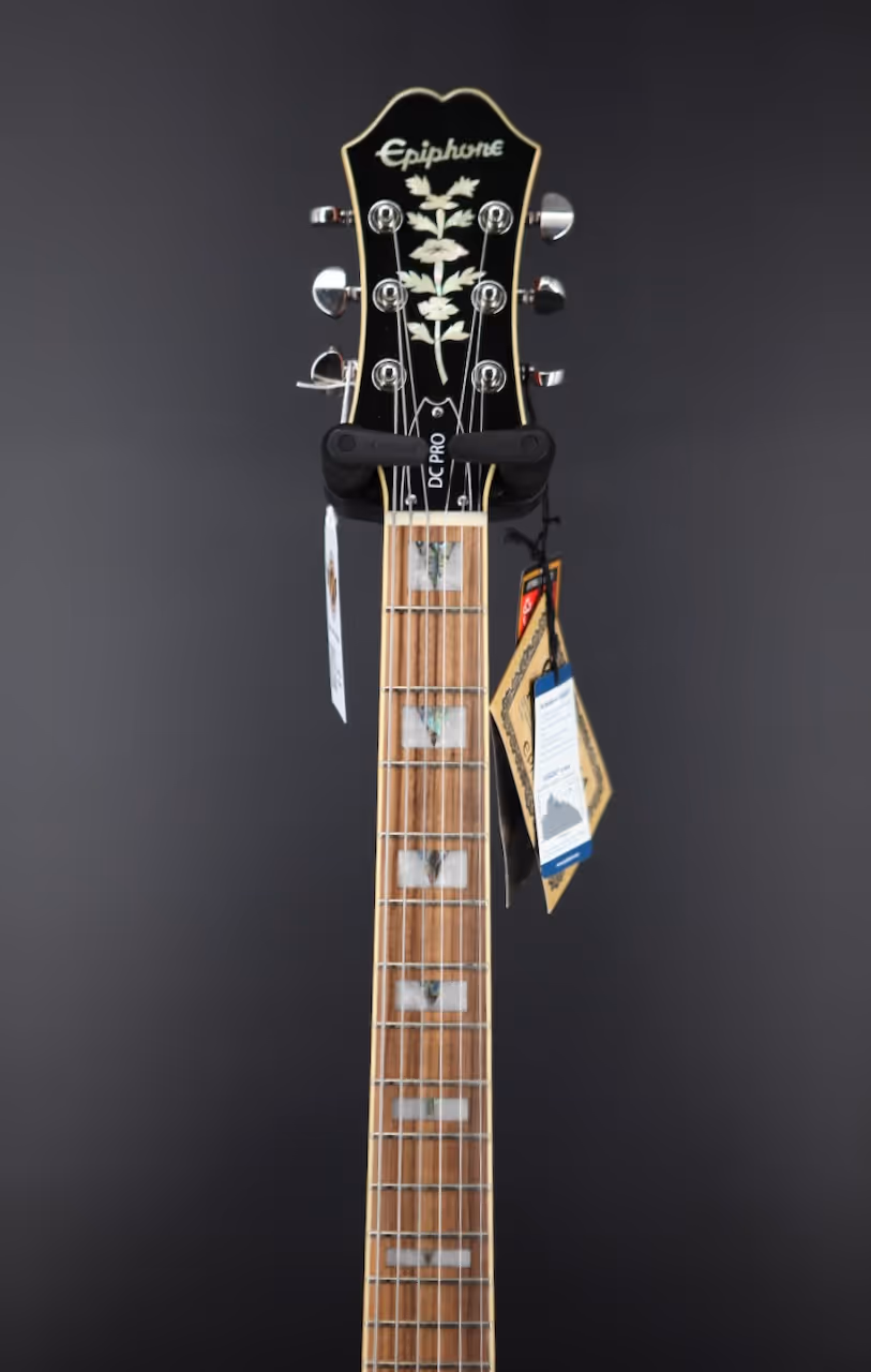 The DC Pro’s comfortable, deep-set, custom C-shaped mahogany neck takes playability to a new level. Its easy-playing pau ferro all-access fingerboard includes 24 medium jumbo frets, a 24.75" scale, 12" radius, and Graph Tech nut. And it looks as great as it plays, thanks to eye-popping block-and-triangle fingerboard inlays, in addition to a dovewing headstock with an iconic 1940s-era vine inlay and a pearloid Epiphone logo. The guitarists here at Sweetwater appreciate the look and feel of the DC Pro.