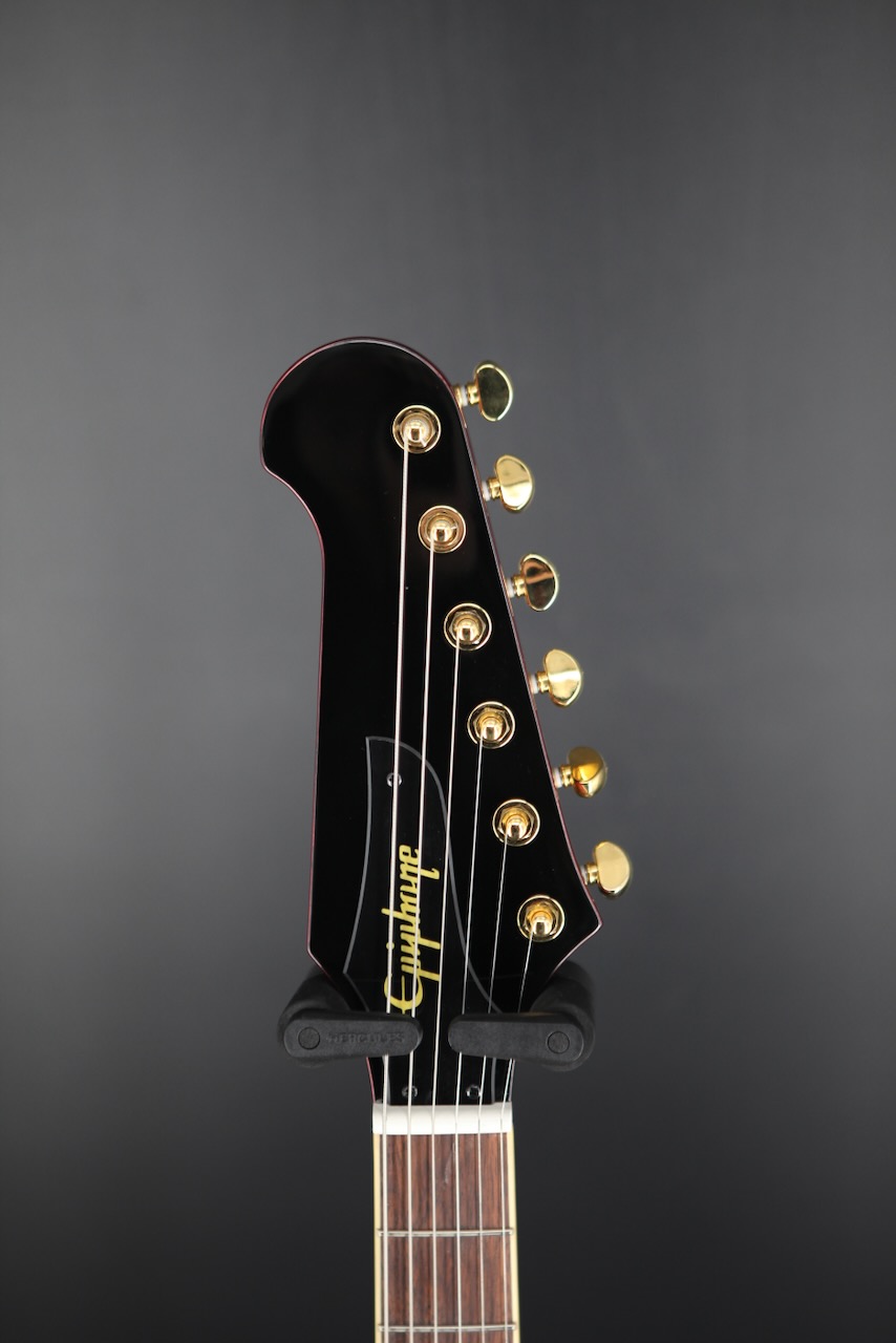 This Epiphone "Inspired by Gibson" Firebird rocks a reverse body and headstock design as originally introduced in 1963 -- Gibson's first neck-through-body, for rich, warm tonality and incredible sustain. A Slim taper neck with a bound, Indian laurel fingerboard and acrylic trapezoid fingerboard inlays offers fast and effortless playability. The refreshed Firebird is outfitted with a set of ProBucker FB720 pickups to recapture the scorching output and searing tones of the original voice for which the Firebird is known. It also features a rolled neck for a comfortable feel, graph tech NuBone nut, era-appropriate wiring and CTS pots.