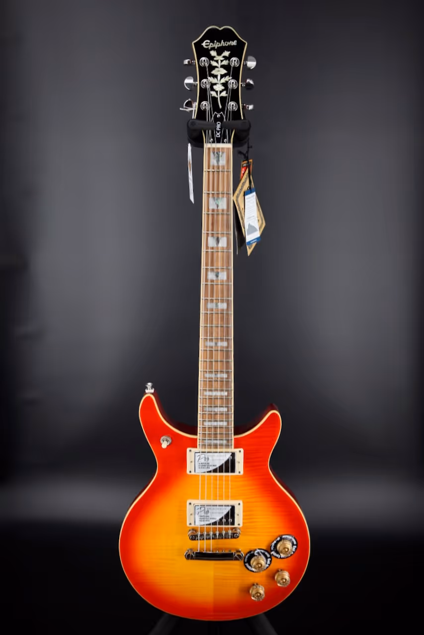 Attached is a comfortable rounded “C” neck with a familiar 24.74 inch scale length fretboard containing contemporary medium-jumbo frets. Completing the humble aesthetic are mother of pearl dot inlays and a vintage sunburst finish. Hardware features nickel Epiphone ivory colour machine heads and bridge pins. The ever-reliable bone nut and saddle combo keep the J-45's tuning super stable.