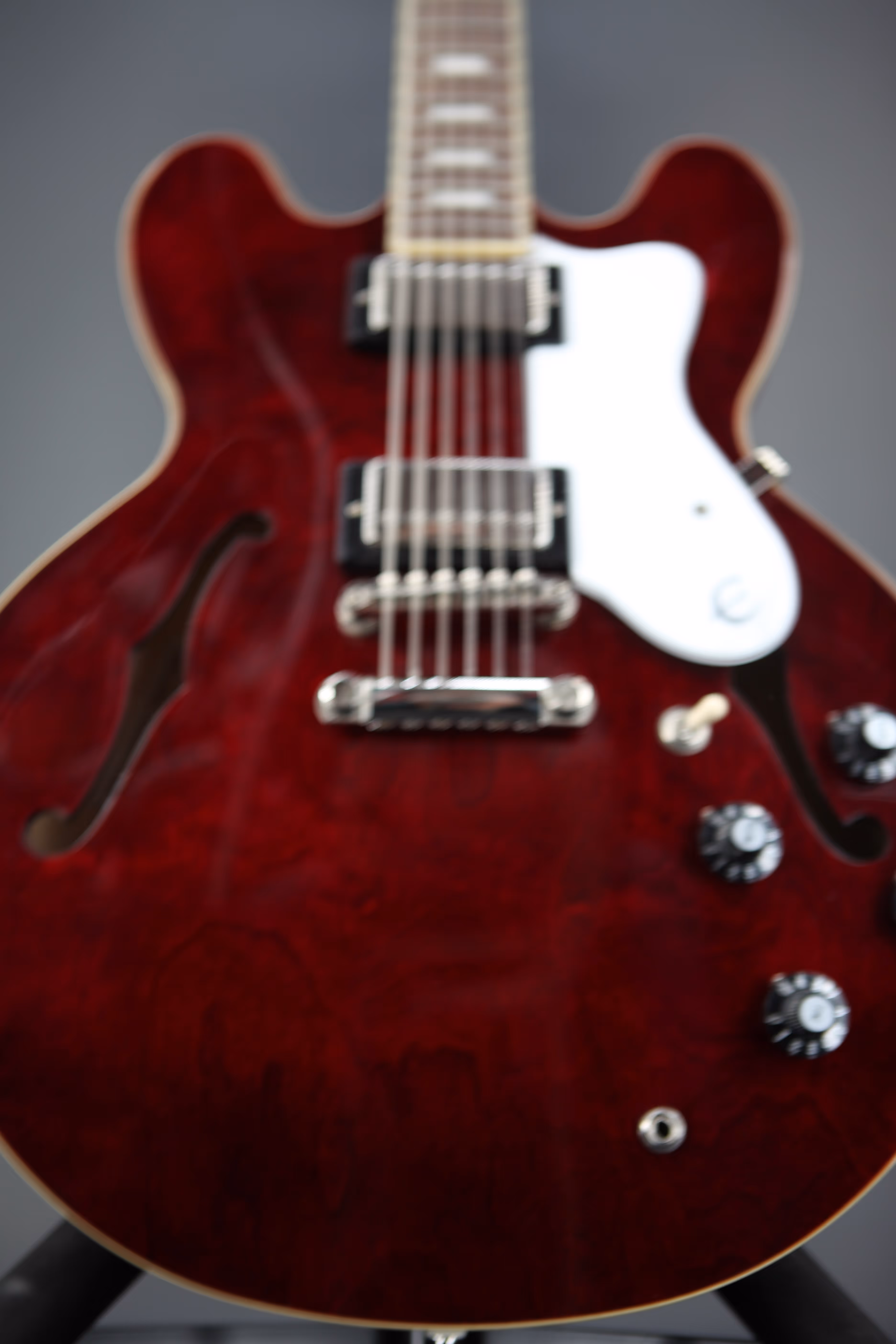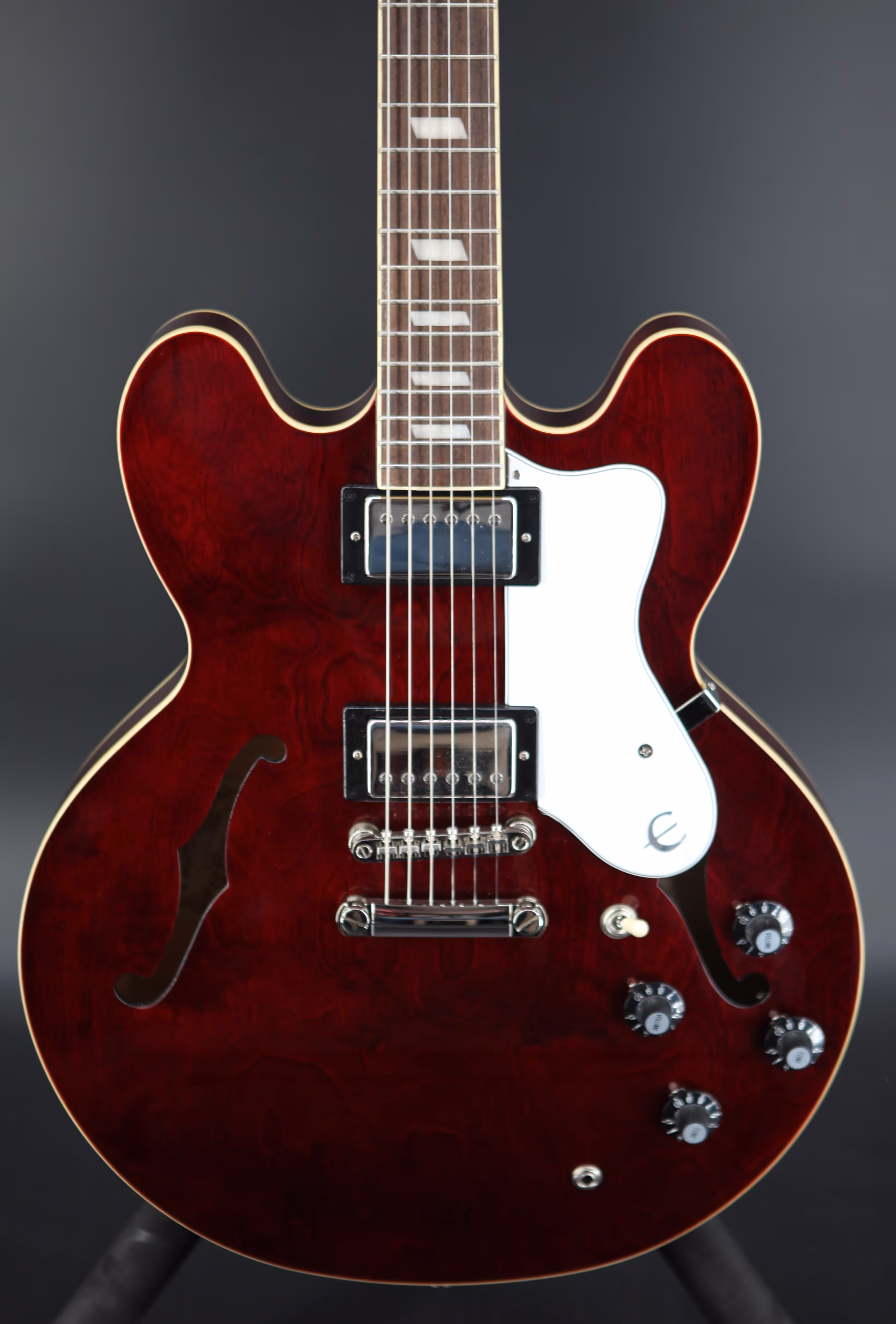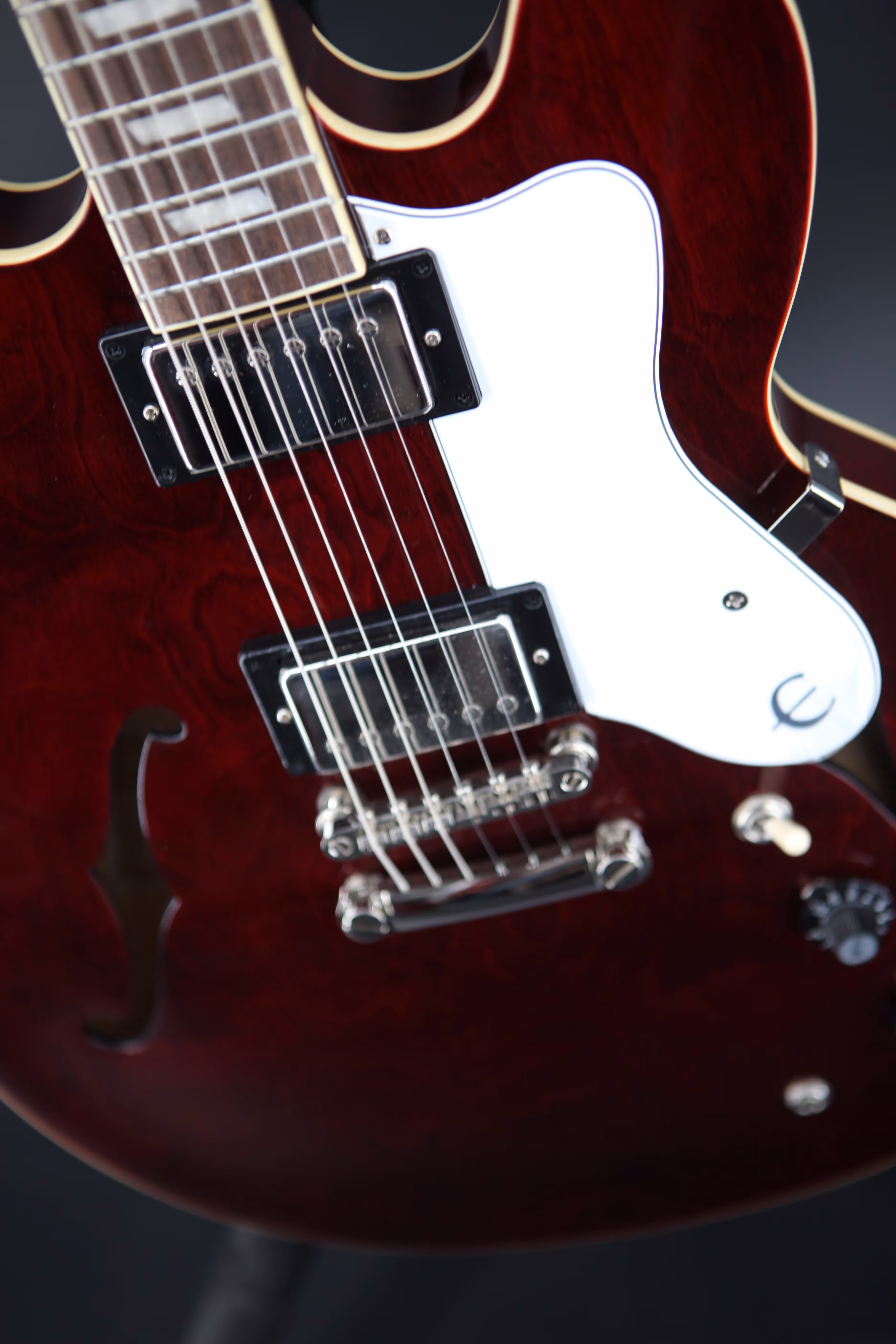 Noel Gallagher is one of the UK's most successful songwriters and his work with Oasis in the '90s defined a generation. With countless number one singles and multi-platinum selling albums under his belt, Noel continues to fill arenas worldwide, nearly thirty years on from the release of Oasis' landmark debut album "Definitely Maybe". The Epiphone Noel Gallagher Riviera honours the former Oasis guitarist, paying tribute to his undeniable impact on British music. Featuring a semi hollow 5-ply layered Maple body, the Riviera sports a stunning dark wine red finish, closely matched to the original models from the era. A SlimTaper C shape Maple neck includes a period correct volute, designed to improve stability on the neck and headstock. Other historically accurate appointments include "E" logos on the truss rod cover and pickguard and a brown sound hole label, giving the guitar a cool vintage vibe. An Indian Laurel fingerboard offers a smooth playability whilst maintaining a vintage look and is adorned with Pearloid Trapezoid inlays. At the heart of the Riviera is a pair of Epiphone Classic PRO pickups, offering up a host of vintage humbucking tones. With two volume and two tone controls, and a 3-way selector switch, there are plenty of tone shaping options on hand. These dynamic pickups pair beautifully with the semi hollow body, producing a resonant tone that responds to your playing style. The Riviera is a must-have for avid fans of Noel Gallagher and Oasis and comes in an Epiphone hardshell case, offering premium protection and convenient storage.