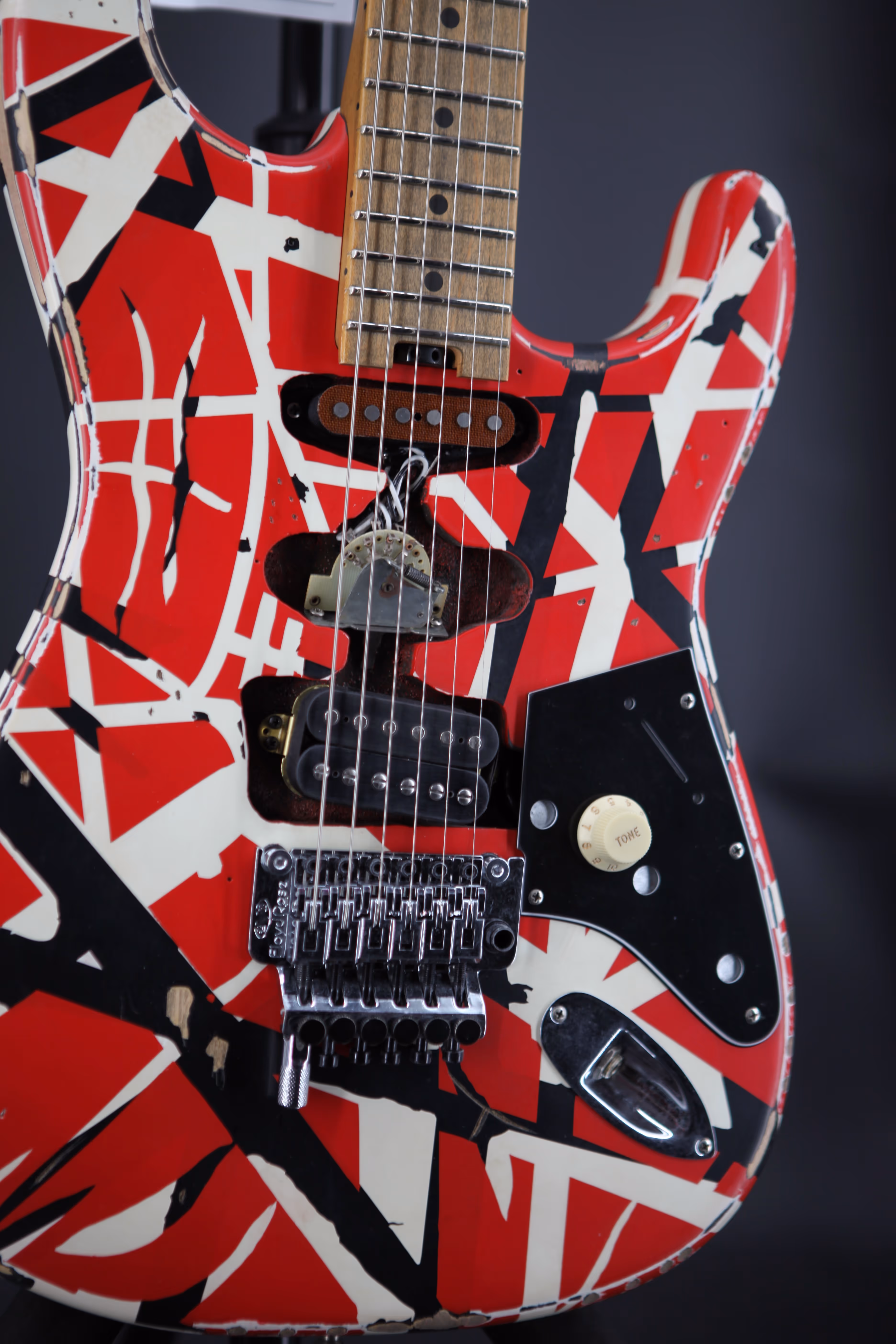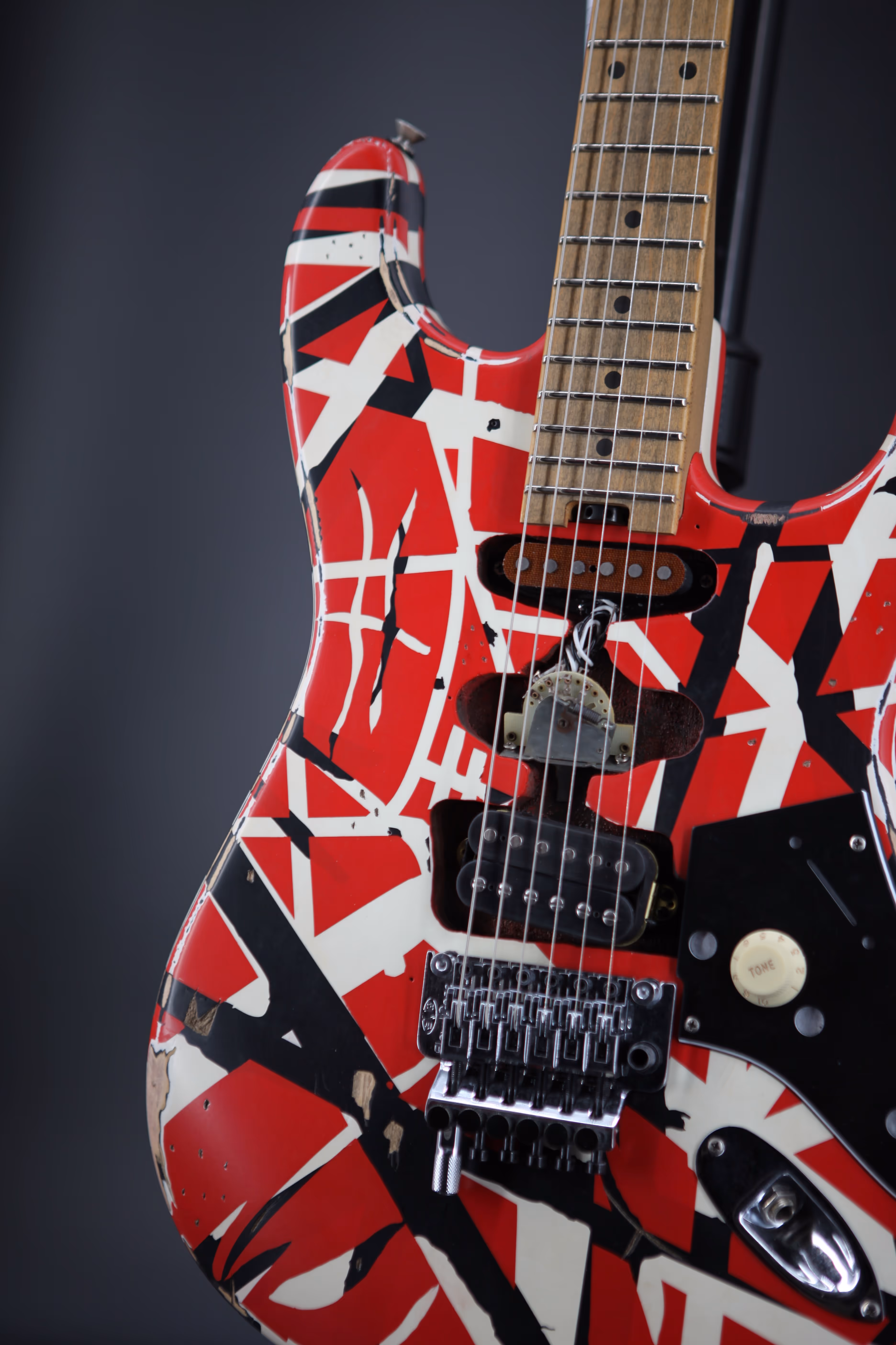 Widely regarded as the most recognizable electric guitar ever, Eddie Van Halen’s iconic and revered Frankenstein guitar now comes your way with a price tag the everyday musician can afford in the form of the EVH Striped Series Frankie. Sporting Eddie’s famed red with white-and-black-striped paint job and a worn-in reliced look, the all-new Frankie features a basswood Stratocaster-style body paired to a graphite-reinforced quartersawn maple neck. An oiled finish on the back of the neck allows for hours of playing comfort, while the 12”-16” compound radius maple fingerboard with 22 jumbo frets was designed for fast and furious playing styles. Routed for an HSS pickup configuration just like Eddie’s original, Frankie features an EVH Wolfgang humbucking bridge pickup with a dummy Strat neck pickup and a dummy five-way blade housed in the middle position. A sturdy and dependable EVH-branded Floyd Rose locking trem and Floyd Rose locking nut work in tandem for precise tuning even with extreme changes in pitch, while the EVH D-Tuna retunes to drop-D and back with strict accuracy at the flick of a finger. Other unique features include a white skirted Strat-style single volume control knob (labeled “tone”), custom black pickguard, reliced chrome hardware, standard strap buttons and EVH neck plate.