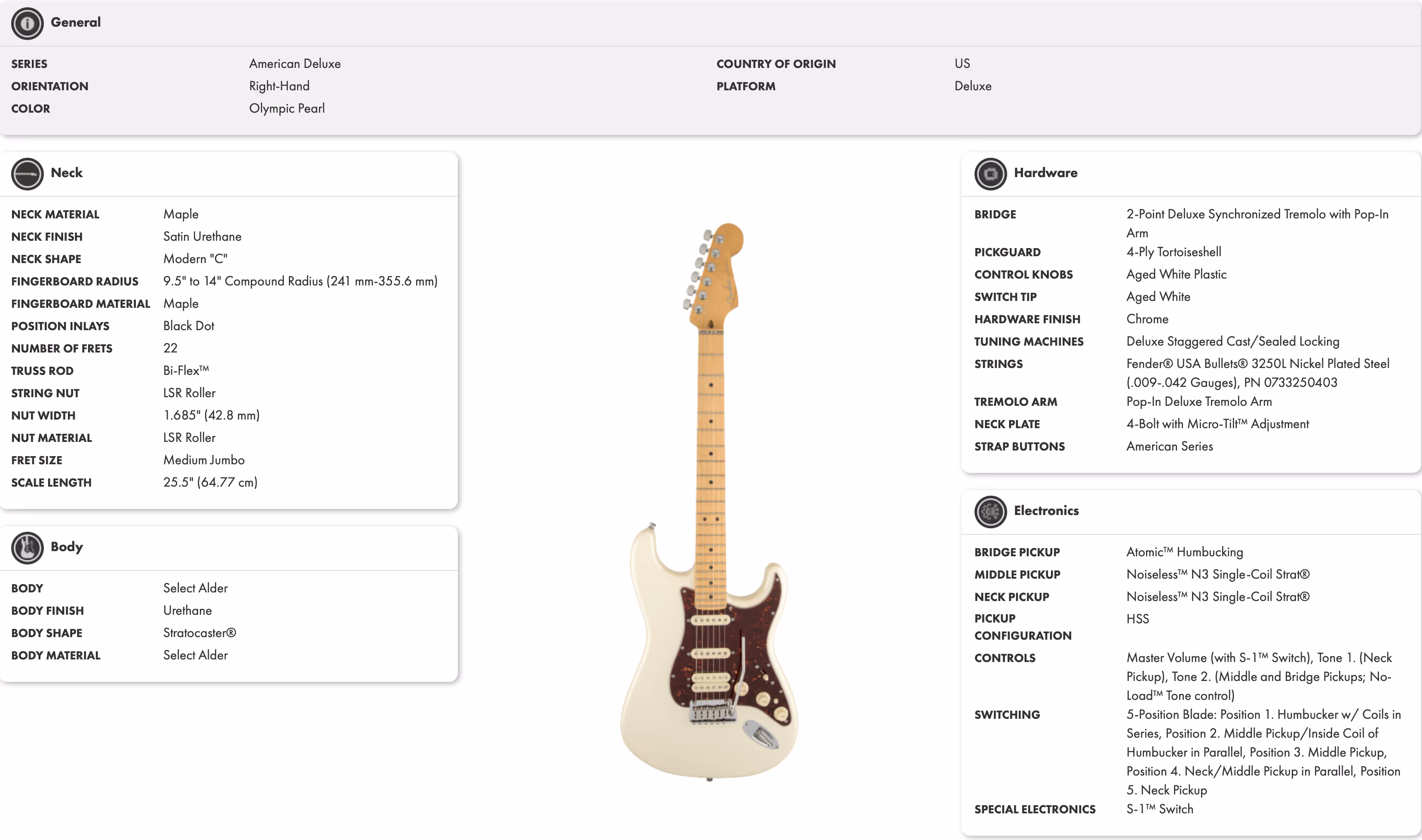 Fender's American Deluxe Stratocaster® HSS guitar is for guitarists who want a little more. A compound radius fingerboard allows effortless string bending anywhere along the neck, and two N3 Noiseless™ pickups provide improved Stratocaster tones while the DH-1 humbucking bridge pickup has more output for fatter lead tones; all with no hum. Reconfigured S-1™ switching offers other distinctive tonal options. The "passing lane" switch instantly routes your signal from any pickup position to the bridge position with the tone circuit bypassed, giving you more overtones and a little more volume. Other features include staggered locking tuners, LSR roller nut, two-point synchronized American Deluxe tremolo bridge with pop-in arm, and beveled neck heel.
