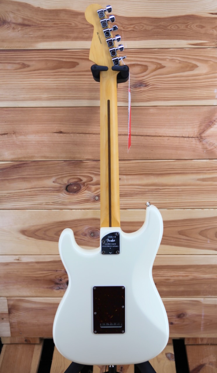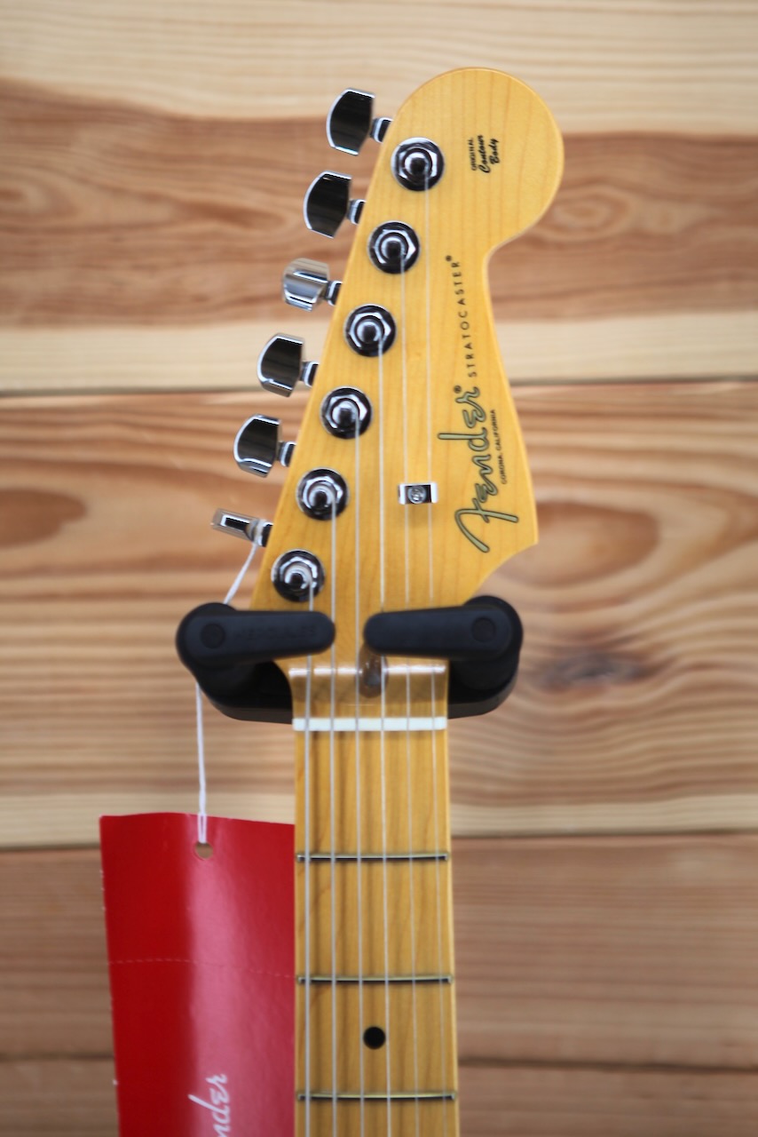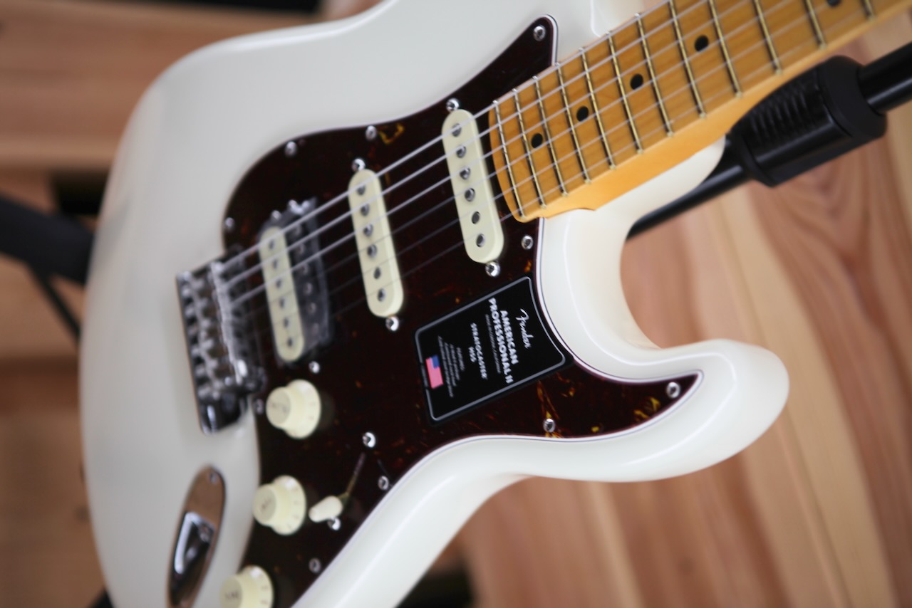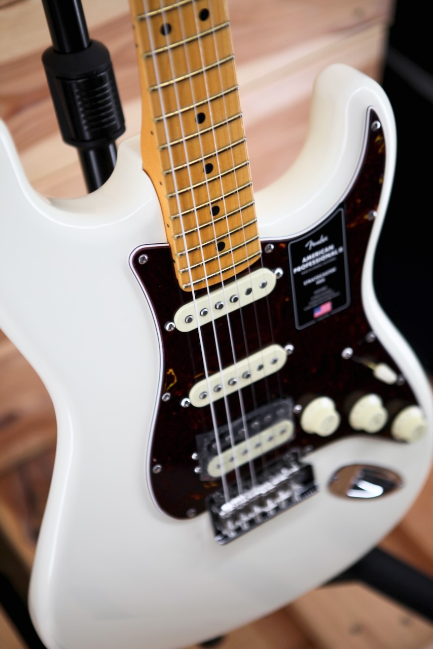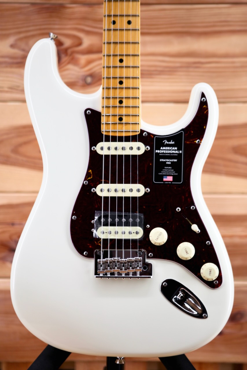 The American Professional II Stratocaster® HSS draws from more than sixty years of innovation, inspiration and evolution to meet the demands of today's working player. Our popular Deep "C" neck now sports smooth rolled fingerboard edges, a "Super-Natural" satin finish and a newly sculpted neck heel for a supremely comfortable feel and easy access to the upper register. New V-Mod II Stratocaster single-coil pickups are more articulate than ever while retaining bell-like chime and warmth, while the Double Tap™ bridge pickup delivers punchy humbucking tones as well as calibrated single-coil sounds at the push of a button. An upgraded 2-point tremolo with a cold-rolled steel block increases sustain, clarity and high-end sparkle. The American Pro II Stratocaster HSS delivers instant familiarity and sonic versatility you'll feel and hear right away, with broad ranging improvements that add up to nothing less than a new standard for professional instruments. FEATURES Two V-Mod II single-coil Stratocaster pickups Double Tap™ Humbucking Bridge Pickup Upgraded 2-Point Tremolo with Cold-Rolled Steel Block Deep "C"-shaped neck profile with rolled fingerboard edges Bone nut; 22 narrow-tall frets for easy bending Treble bleed circuit maintains highs when reducing volume Includes Deluxe Molded hardshell case