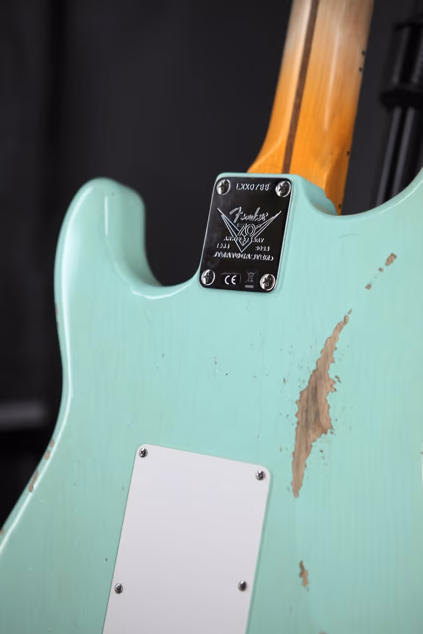 Its one-piece quartersawn maple neck is fashioned with a special 70th anniversary Soft “V” profile based on an incredible Strat® neck from July 1954, topped by a 9.5”-radius fingerboard with 21 narrow tall (6105) frets and a 1.625” bone nut.