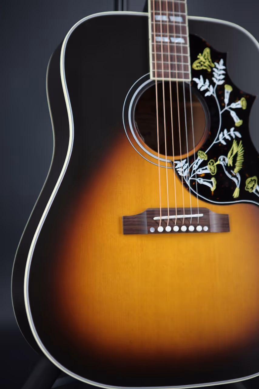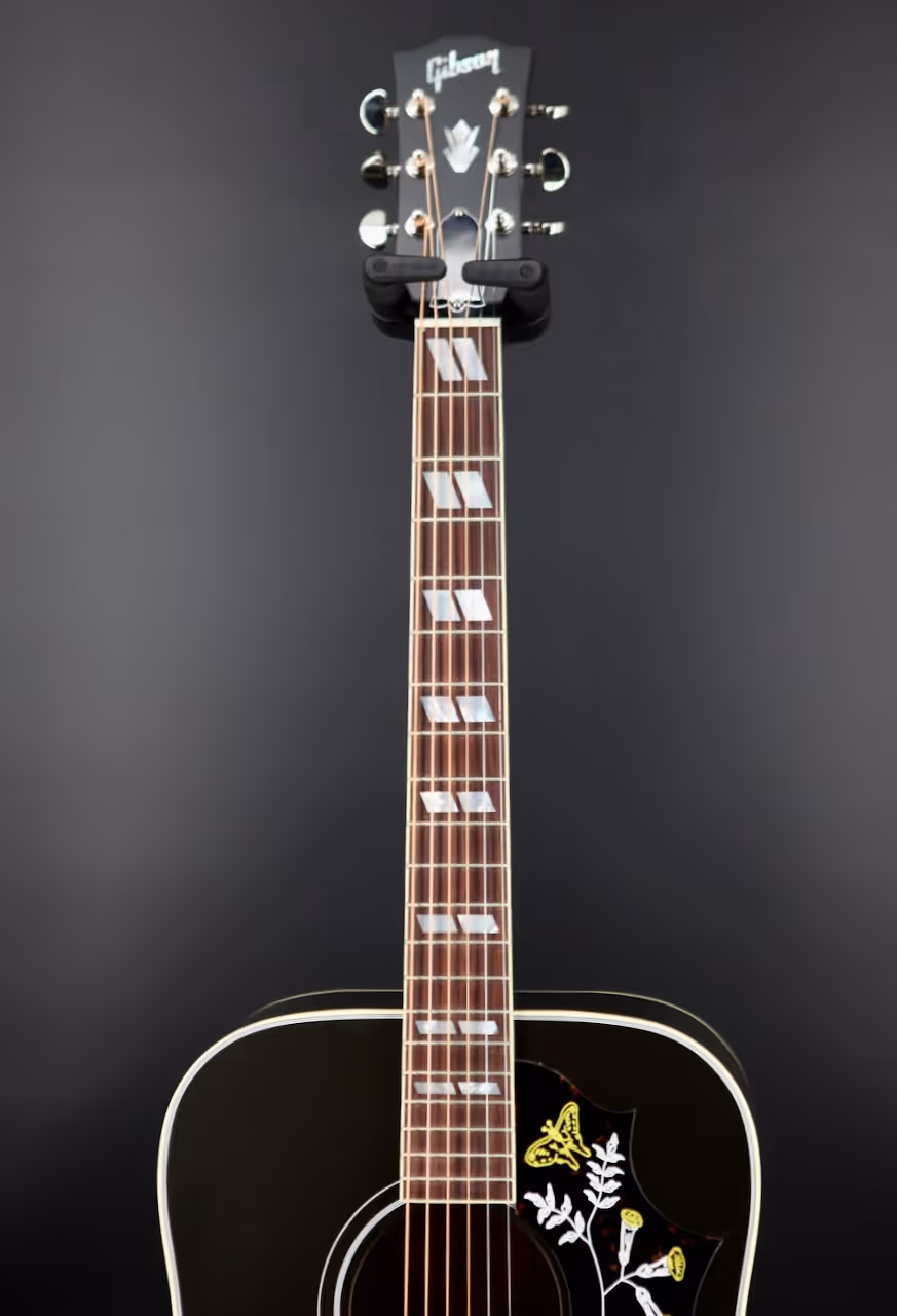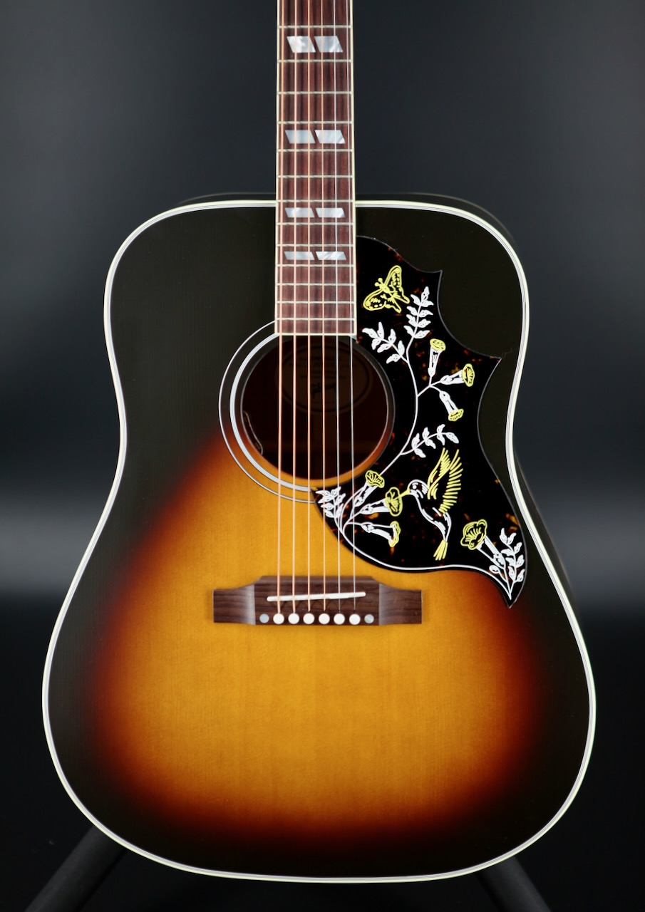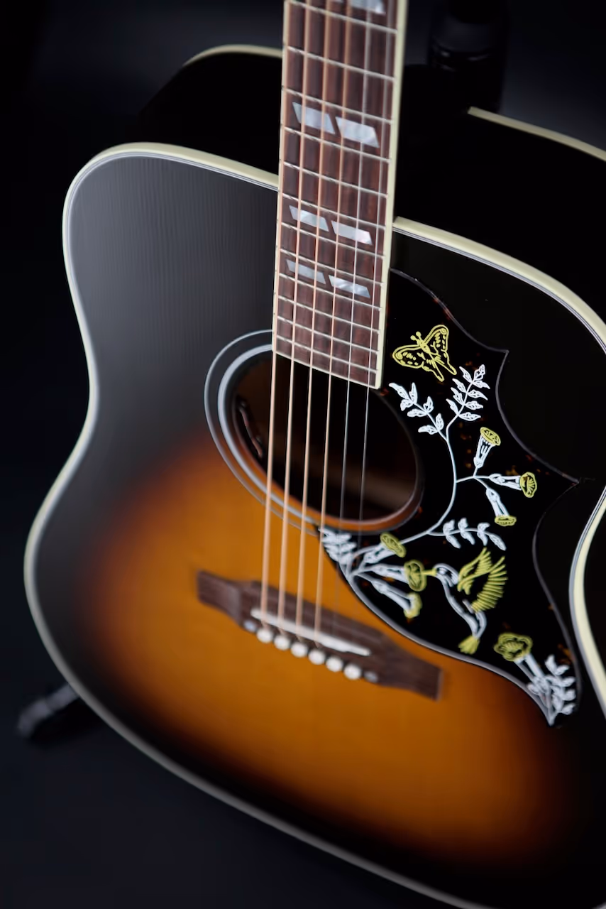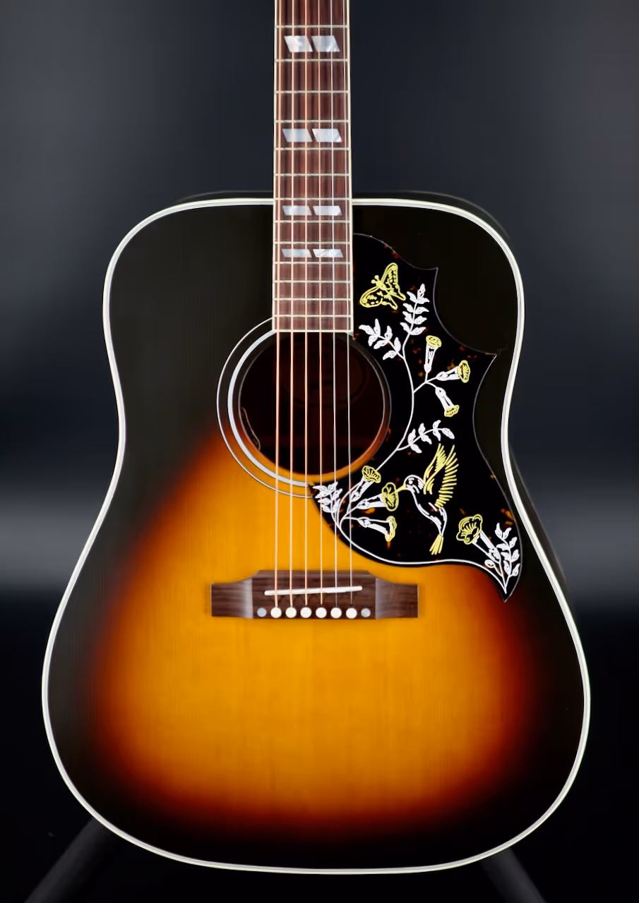 The Hummingbird Faded’s neck is made from satin-finished mahogany, a classic choice that feels natural, sturdy, and fluid. The neck features a smooth 20-fret rosewood fingerboard with stunning parallelogram mother-of-pearl inlays. The fingerboard features Gibson’s reliable 24.75-inch scale, which guarantees a slightly softer, slinkier string feel than the average acoustic — which is especially useful if you’re big on bends, hammer-ons, or progressive fingerpicking! Additionally, this guitar comes equipped with ultra-sturdy Gotoh tuners that ensure reliable performance and plenty of solid playtime — with tuning breaks few and far between.
