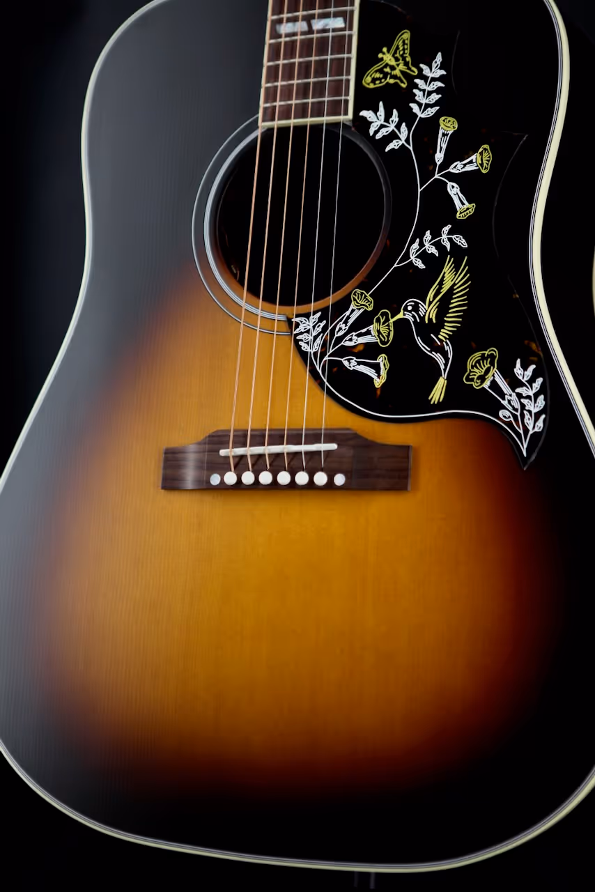Few acoustic tonewood pairings capture the magic of mahogany and spruce. Mahogany shapes and holds notes with excellent focus, sustain, and midrange, while spruce adds a dash of top-end treble magic (not to mention strong volume and projection). This Gibson Hummingbird Faded features a satin-finished Sitka spruce top with mahogany back and sides. Also, premium hardware, including a rosewood saddle and a bone nut, ensures that your guitar strings and tonewoods always resonate with strength and clarity, resulting in a playing experience like no other.