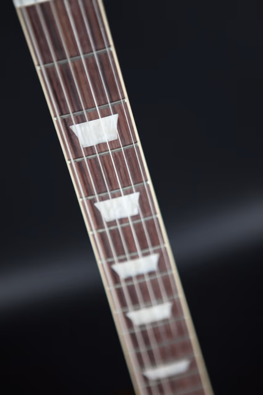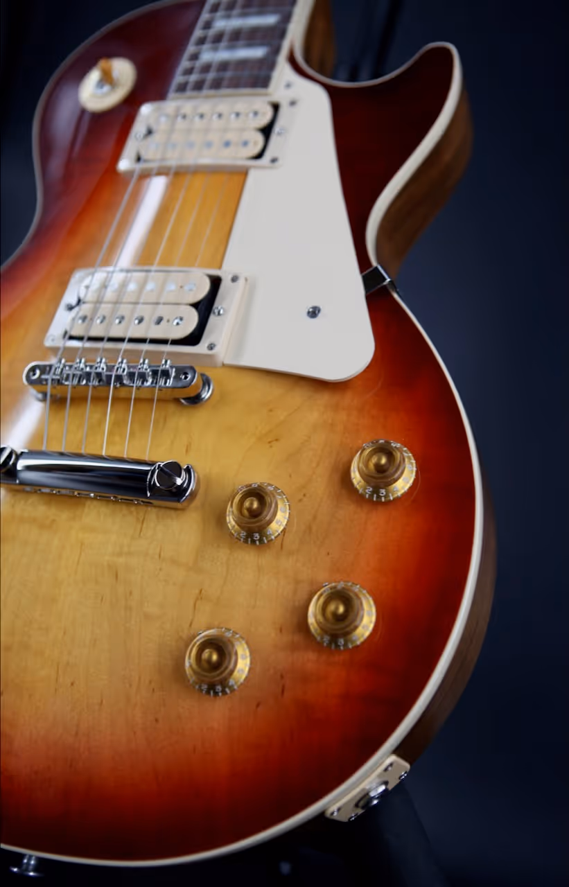 The hardware has been carefully selected to echo the classic Les Paul blueprint. Vintage Deluxe tuners & Gold Top Hat knobs are among the notable features, with Nickel plating and luxurious binding perfectly tells the story of an iconic instrument.