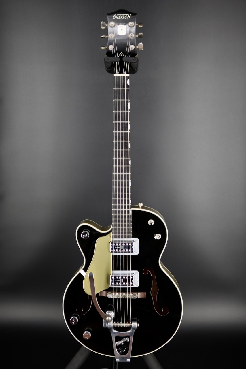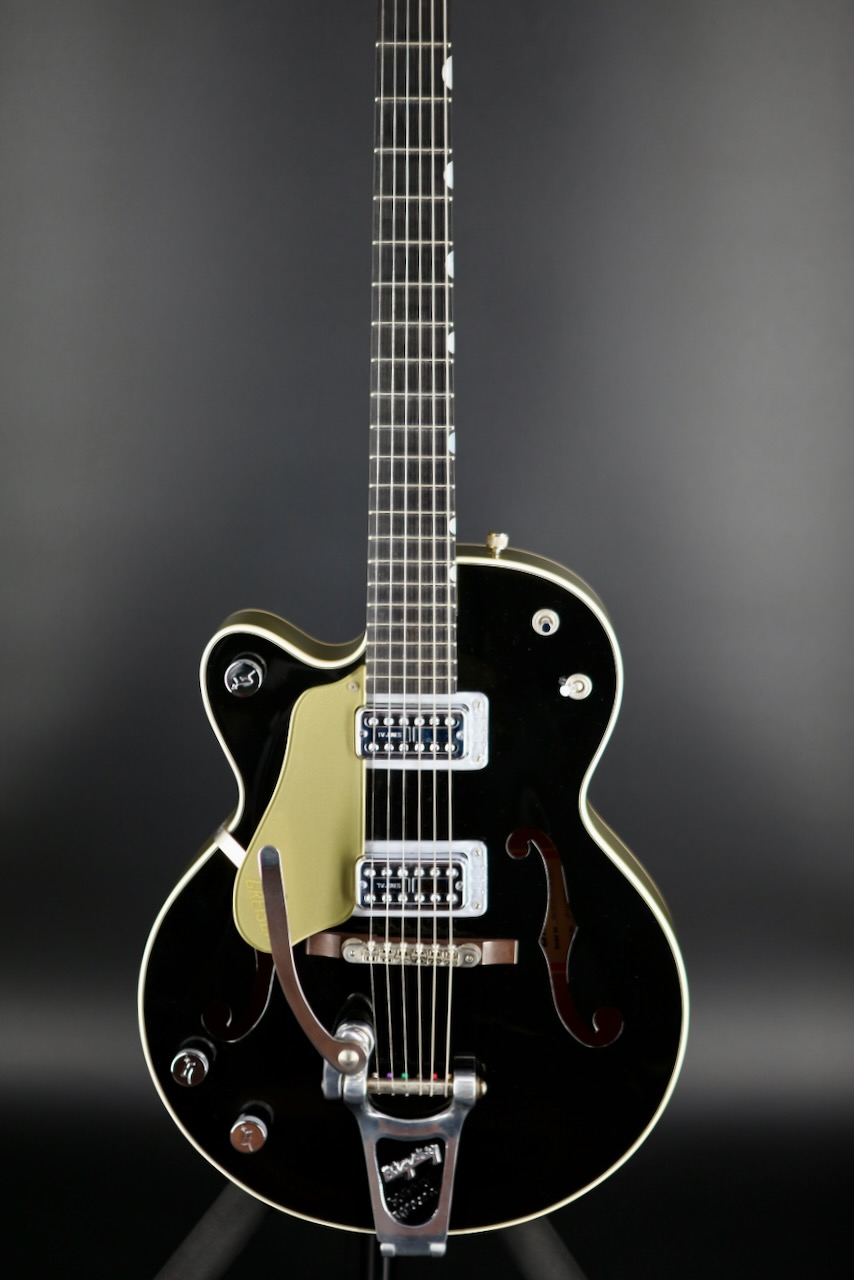 In addition to providing you with uncompromising sounds, this 130th Anniversary model comes heavily equipped with high quality characteristics that make it worthy of wearing the Gretsch name. Ornate appointments include “G Arrow” control knobs, classic F Holes, Anniversary model plaque and pearloid Gretsch logo on headstock, a metallic gold pickguard with silhouette Gretsch® logo, Adjusto-Matic™ bridge with pinned ebony base and Bigsby® B3CB tailpiece, and Gotoh® locking tuners. Also includes a deluxe hardshell case for safely transporting your beloved guitar to your performances.
