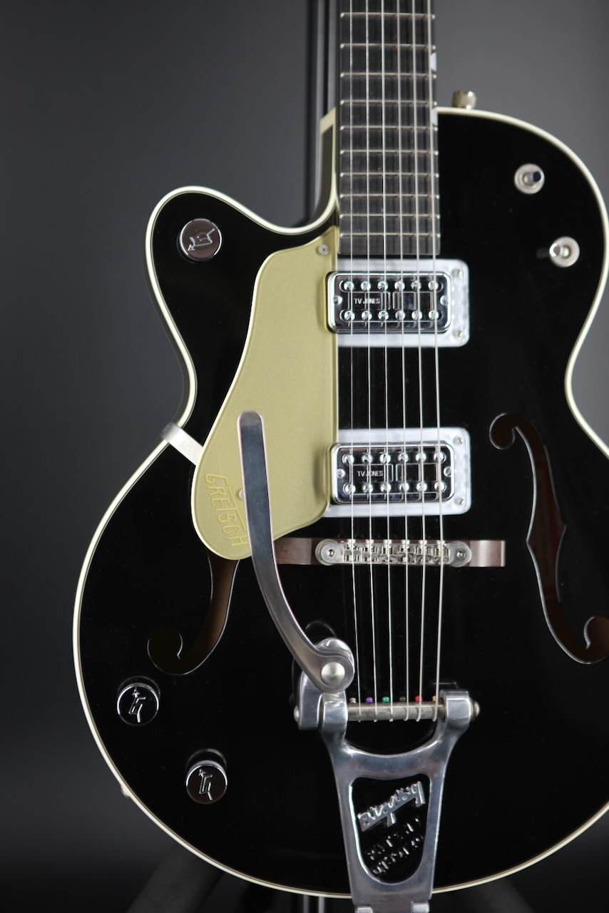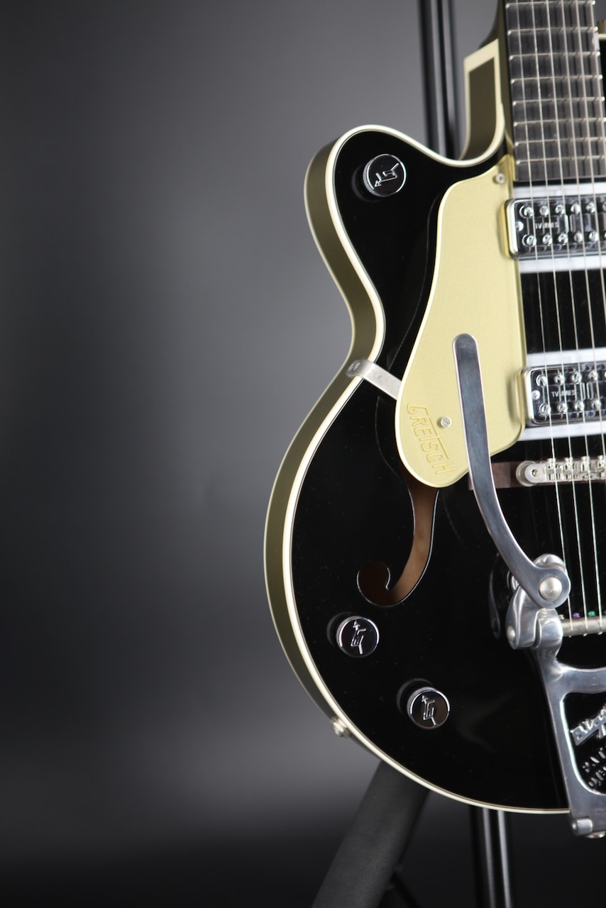 The G6118T-LTV 130th Anniversary Jr features a pair of TV Jones Power'Tron humbuckers that deliver a round top end, natural mid-range presence, and a dynamic clean tone, with a compressed treble. The Power’Tron humbucker pickup was born out of a need to create a pickup with a stronger midrange presence and higher output than the previous Classic pickup from TV Jones. The Power'Tron is wound with more standard magnet wire similar to a PAF-style humbucker. In the bridge position, single treble notes are reproduced with a fuller tone, while bass notes twang out deep and clear, producing a tighter bass with enhanced more clarity. Whilst the neck position delivers a slightly darker and hotter tone when compared to similar pickups like the PAF.