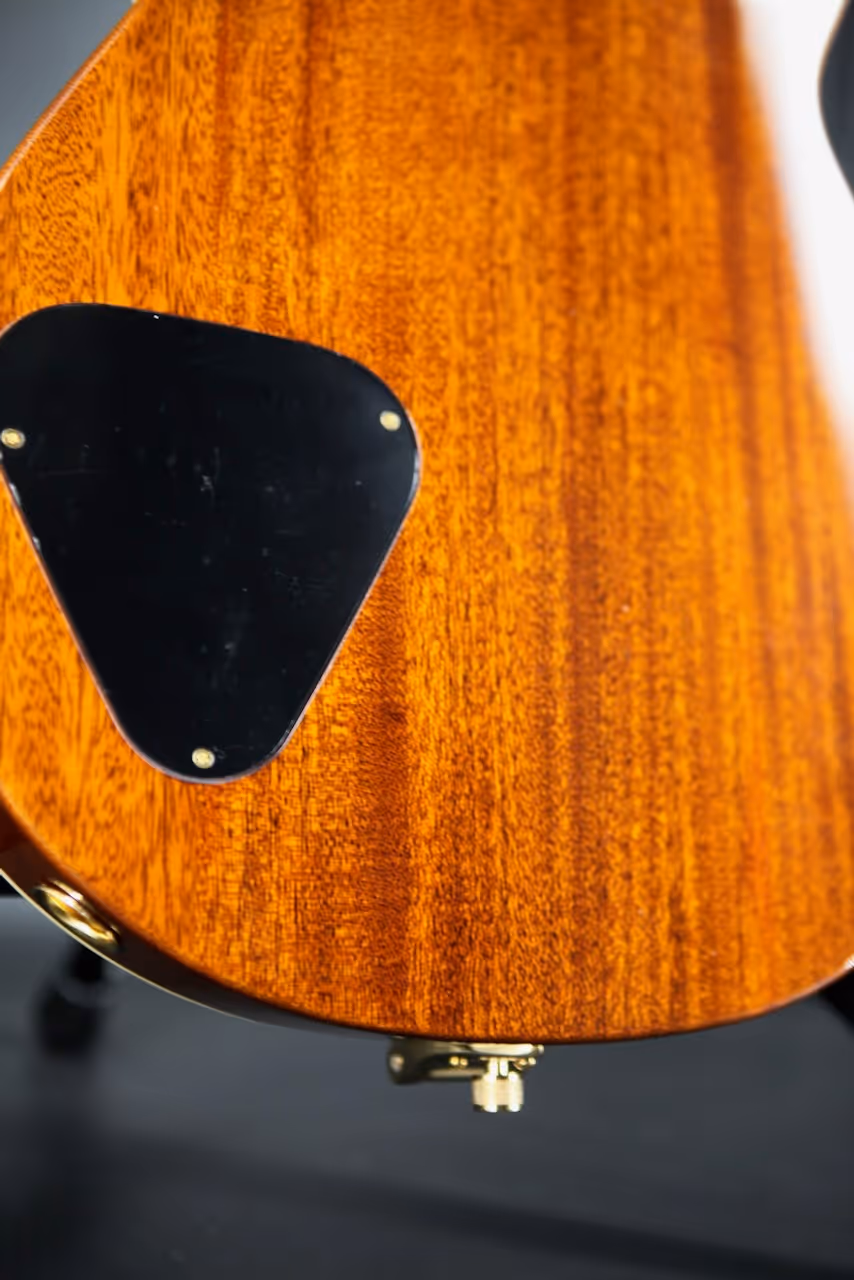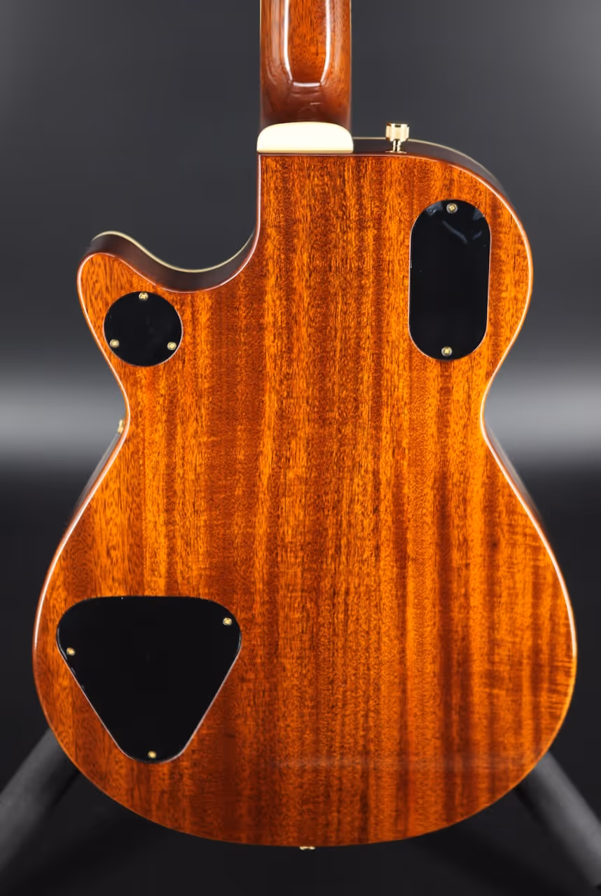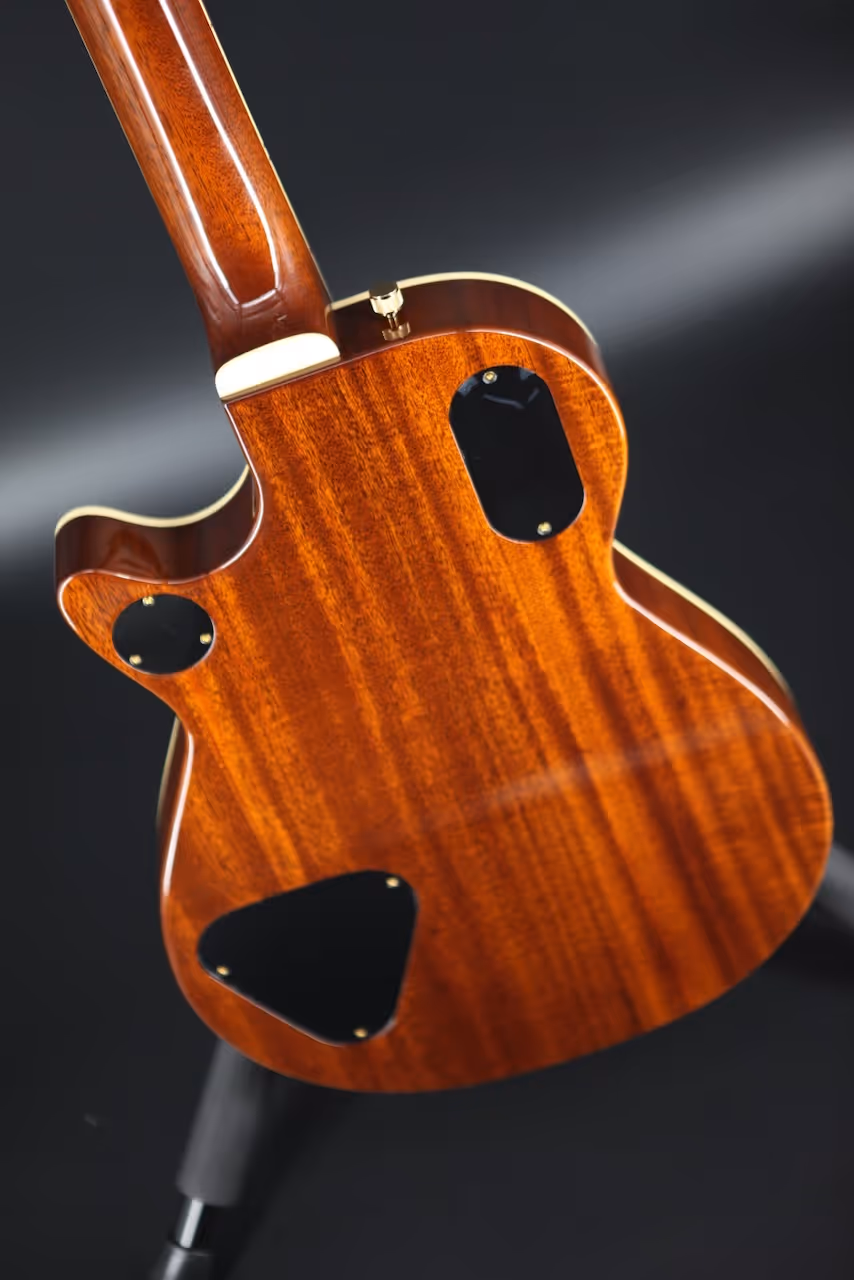 The chambered mahogany body enhances resonance and sustain by allowing air to move freely within the guitar, creating a lively and articulate tone. The arched maple top adds brightness and definition, resulting in a well-balanced sound that cuts through any mix.