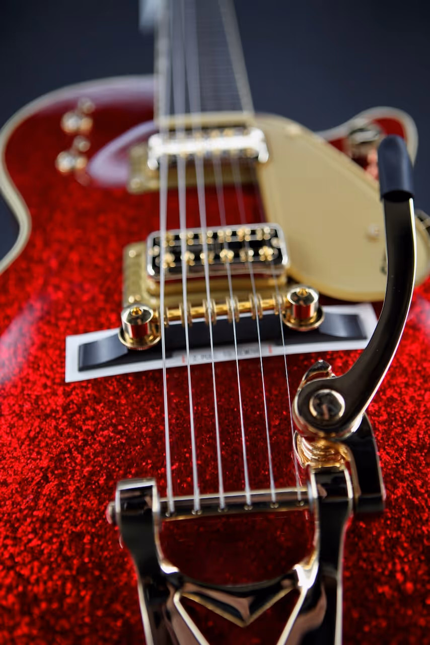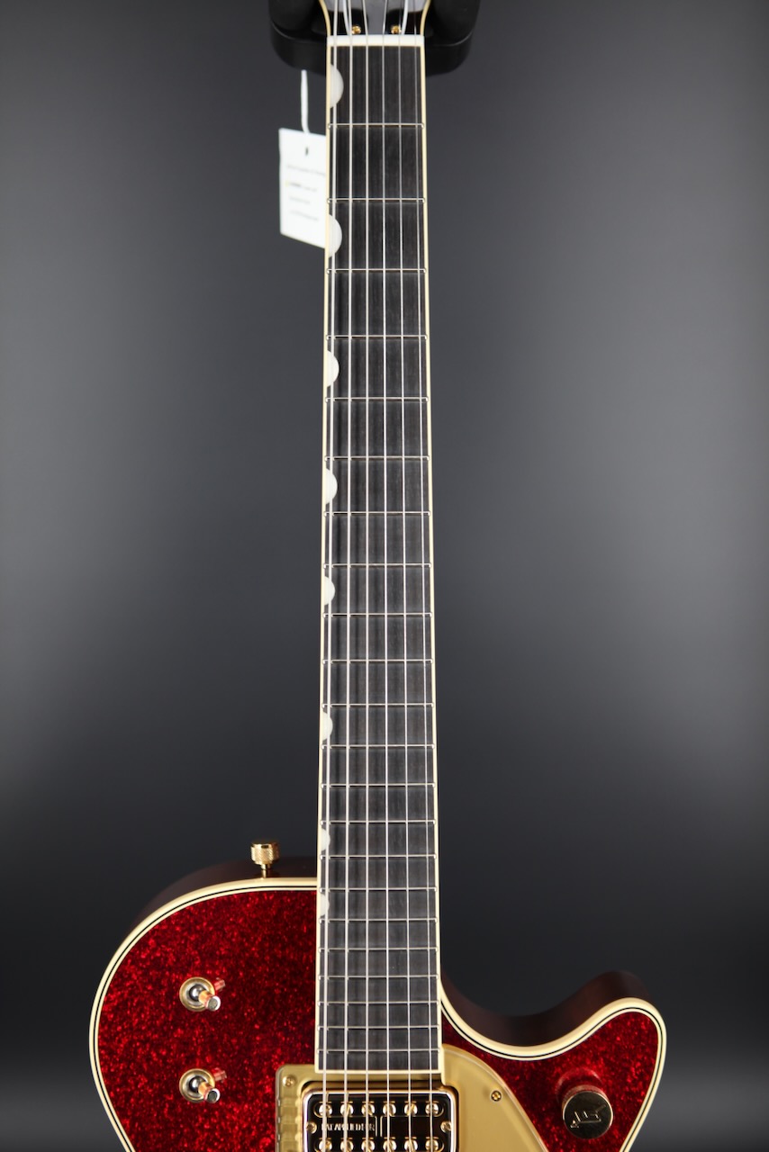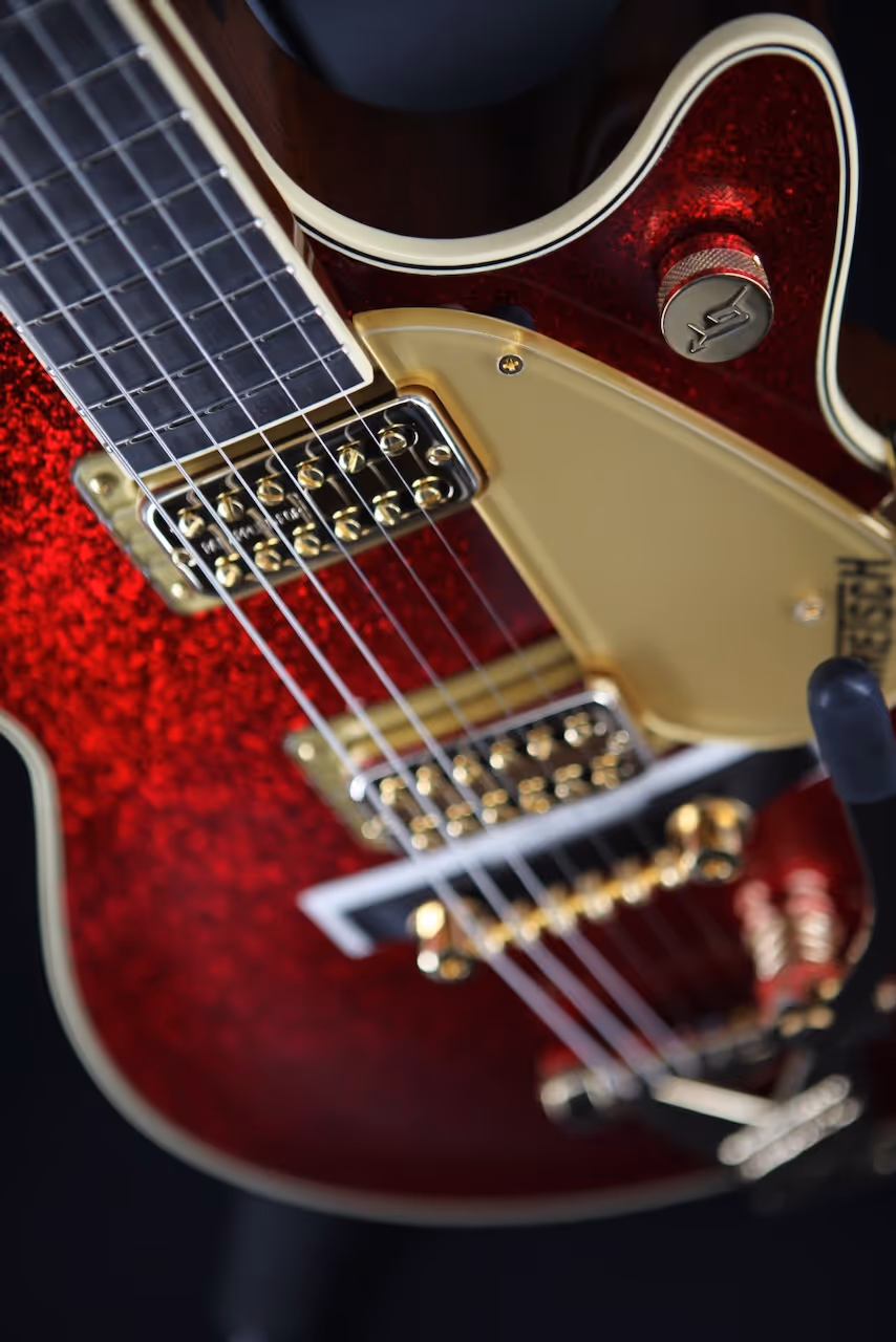 Equipped with TV Jones® Ray Butts Ful-Fidelity Filter'Tron™ pickups, the Sparkle Jet faithfully reproduces the vintage Filter'Tron tone with clarity and punch, ideal for a wide range of musical styles from rockabilly to blues and beyond. The mahogany neck and 12" radius ebony fingerboard provide comfortable playability, while the Grover® Sta-Tite™ tuners and Space Control™ bridge guarantee precise tuning and intonation. Finished in a striking Red Sparkle with gold hardware and a nitrocellulose lacquer, this limited edition guitar is as visually stunning as it is sonically impressive.