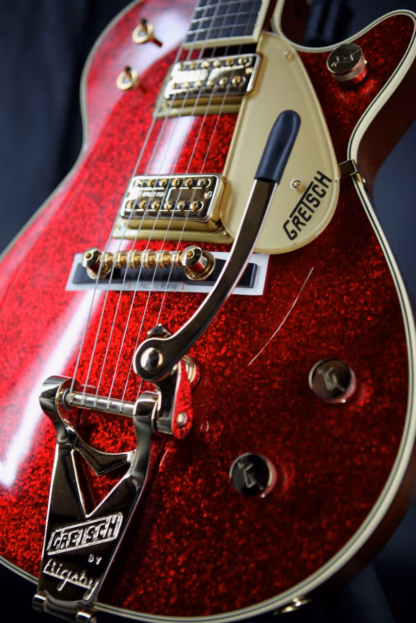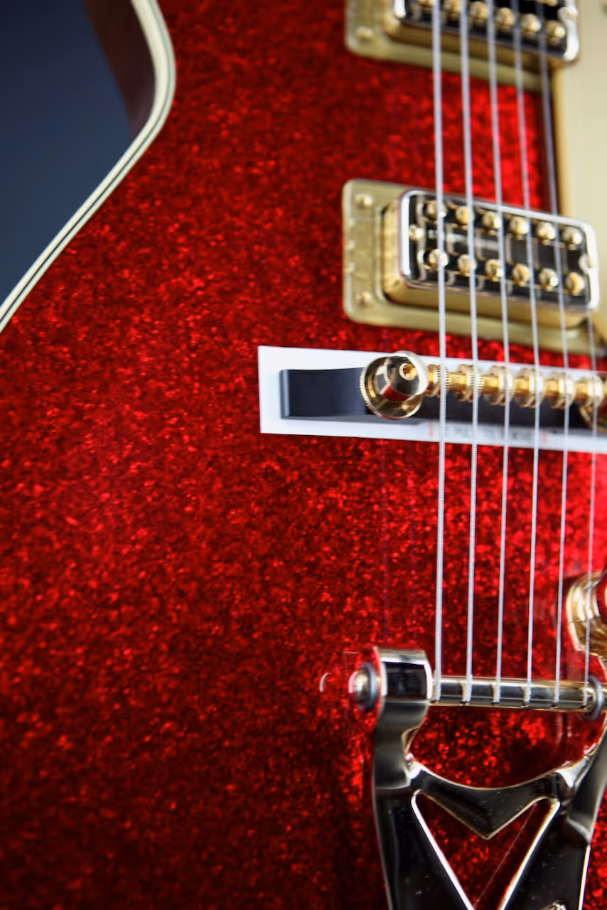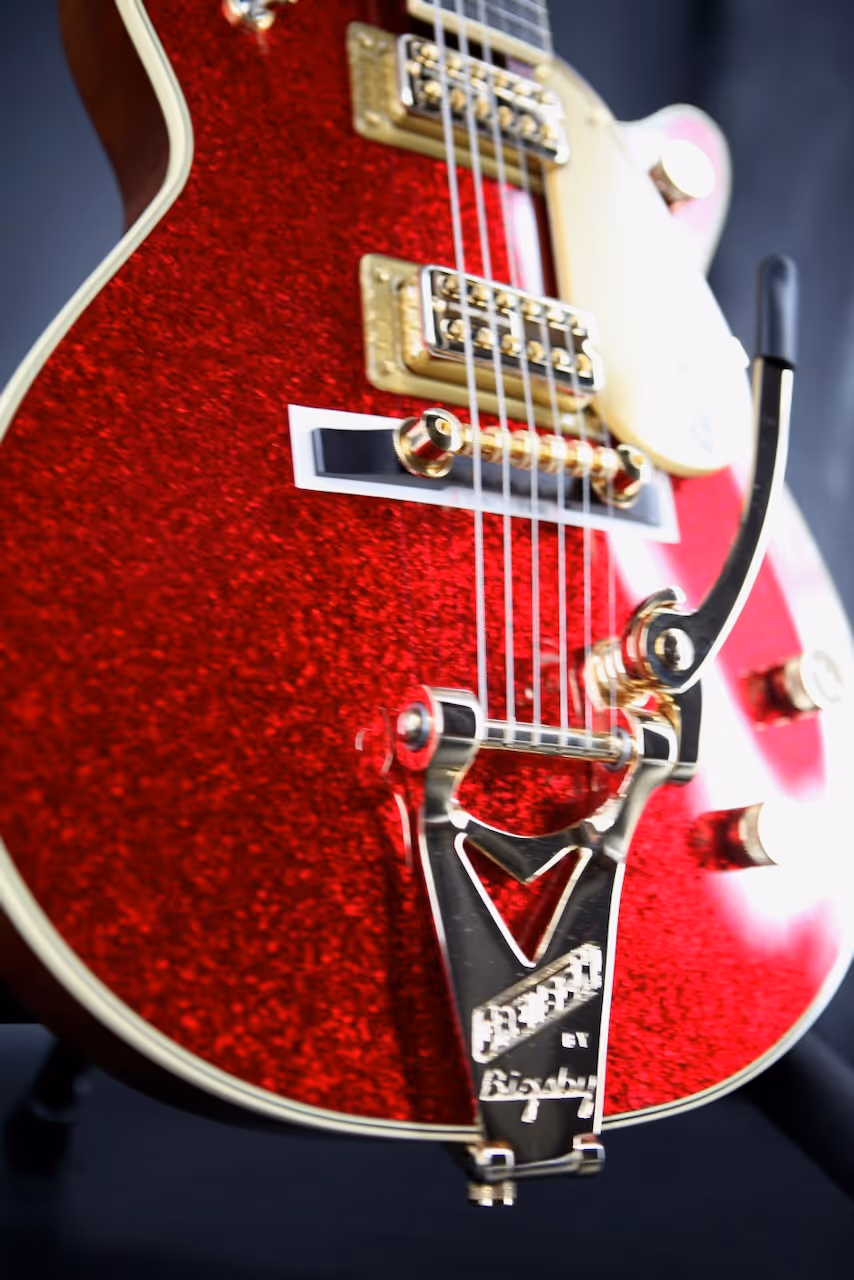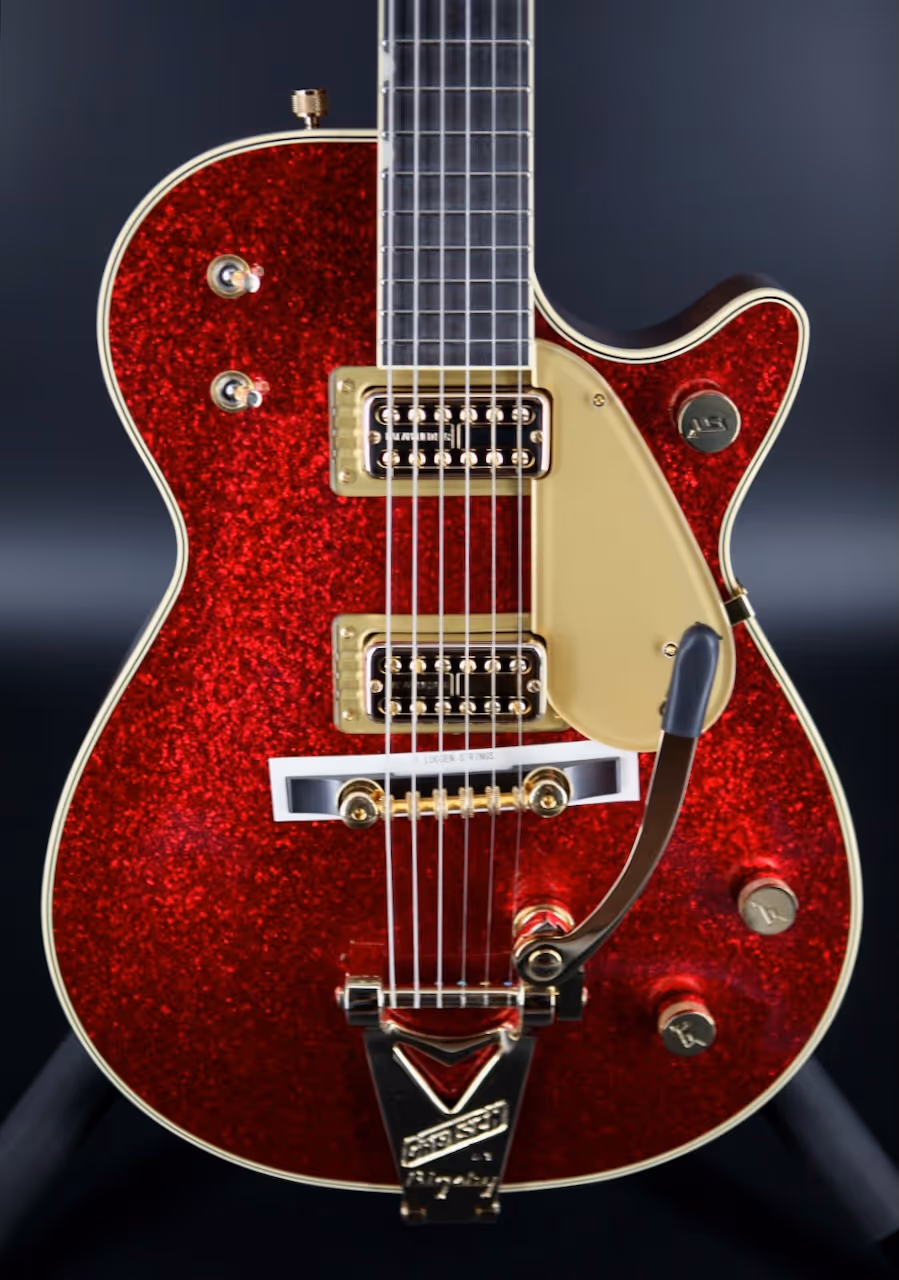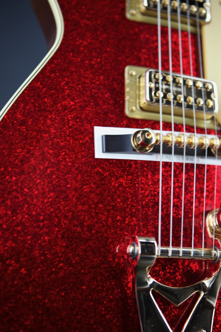 The Gretsch G6129TG-59VS Limited Edition Sparkle Jet in Red Sparkle is a dazzling tribute to the iconic Duo Jet models of the late 1950s, crafted for players who value vintage tone and style. Featuring a chambered mahogany body with an arched maple top, this guitar delivers a rich, resonant sound with enhanced harmonic complexity, making it perfect for those seeking both classic looks and authentic Gretsch sonic character. The ebony fingerboard with aged pearloid Neo Classic™ thumbnail inlays adds a touch of elegance, while the Bigsby® B3GP String-Thru tailpiece ensures smooth vibrato effects and tuning stability.