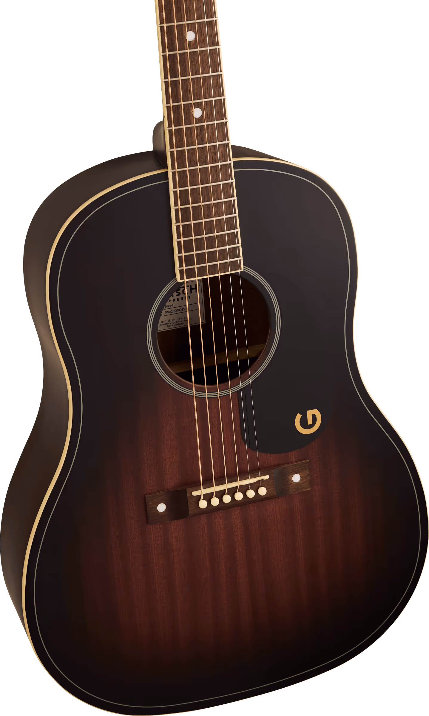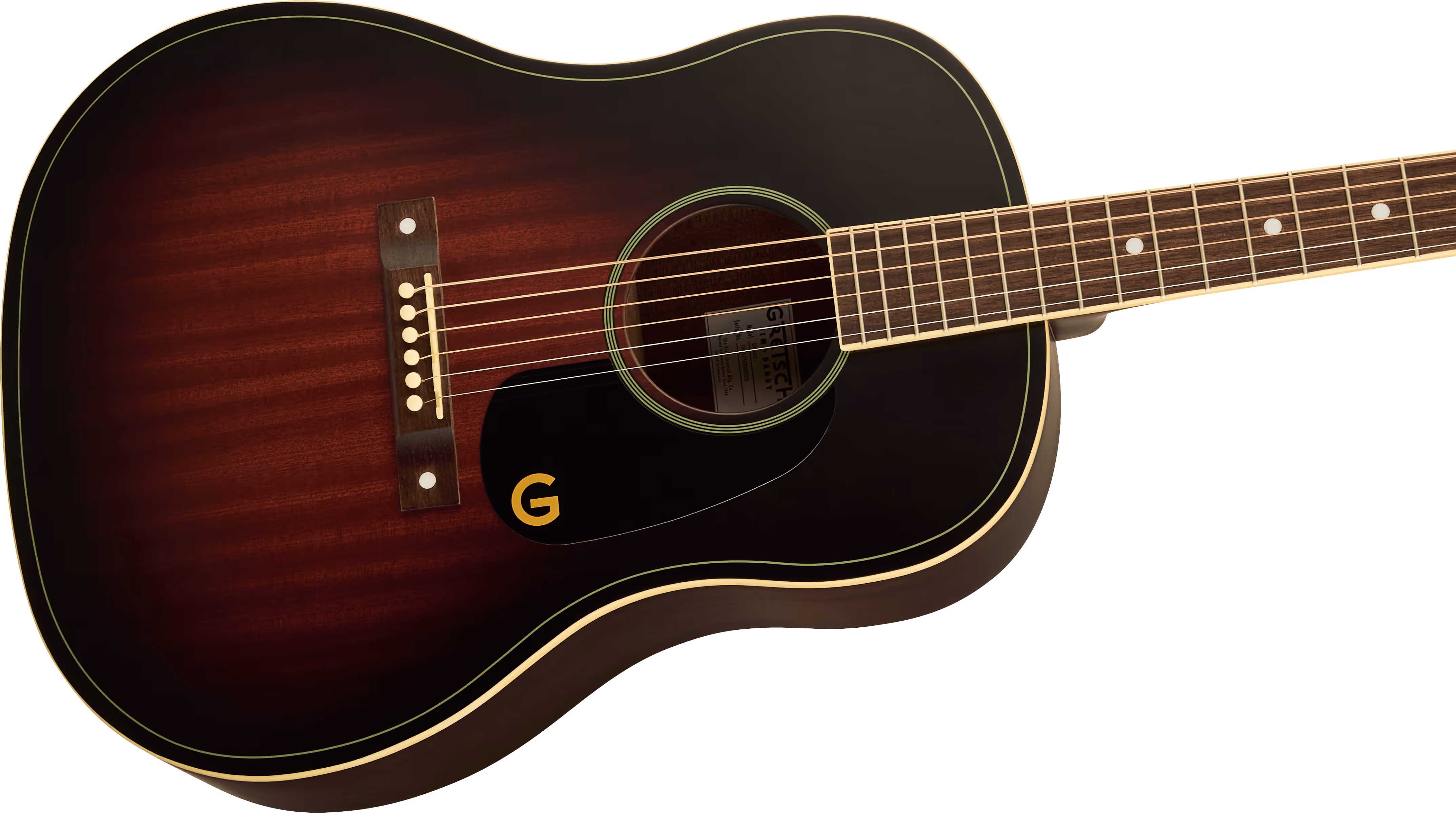 The X-braced body is crafted with select lightweight laminate tonewoods for an optimal balance of woody vintage tone and reliable durability, while the “C”-shape neck presents an inviting feel for hours of old-timey inspiration. Period-correct details such as a vintage-style pinned bridge, “G”-graphic pickguard, painted pinstripe purfling, 3-on-a-plate open-gear tuning machines and oversized dot fingerboard inlays combine for a nostalgic personality destined for any barnburner or jamboree.