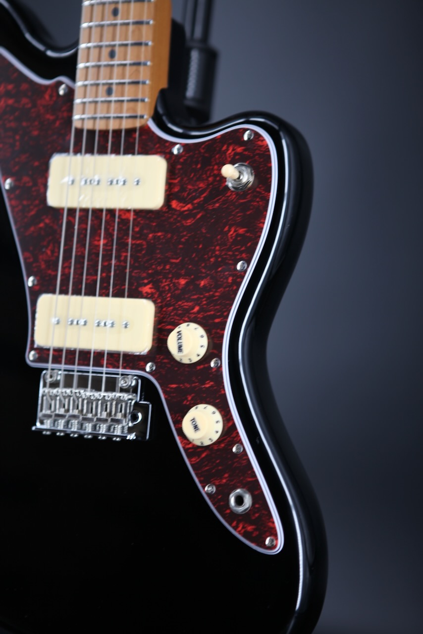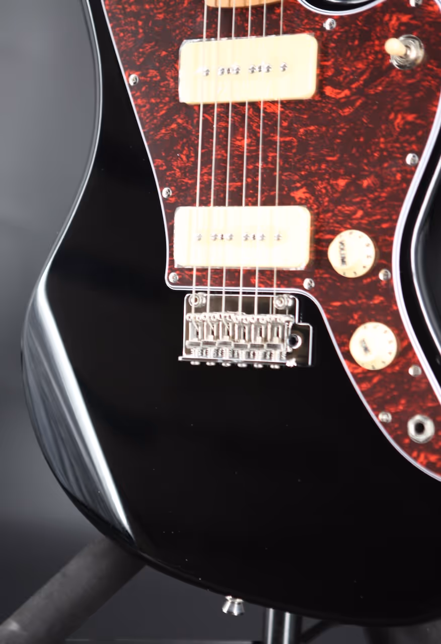 A sleek, no-nonsense workhorse with classic feel and punchy single-coil attitude. A roasted poplar body keeps things resonant and lightweight, while the Canadian roasted maple neck and fretboard deliver a smooth, stable feel. The Modern C profile with a comfy 9.5" radius makes chords, bends and quick runs feel natural across all 22 frets A pair of P90 pickups give you everything from warm cleans to gritty growl, shaped by a simple 1V/1T layout and a 3-way switch for quick tweaks mid-set. A fixed bridge adds sustain and rock-solid tuning, backed by a polymer fibre nut and double action truss rod for reliable setup control. Finished in Black with chrome hardware and machine heads, it's a tidy, gig-ready package built to get the job done