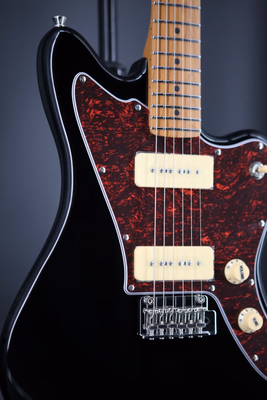 The JJ-300 centres around a pair of P90s that dish out warm cleans, gritty bite, and that classic midrange growl that cuts through a mix. Roll back the volume for glassy edge-of-breakup sparkle, or push your amp and enjoy focused, articulate drive. It's a versatile, musical setup that covers indie jangle, blues snarl, and garage crunch with ease