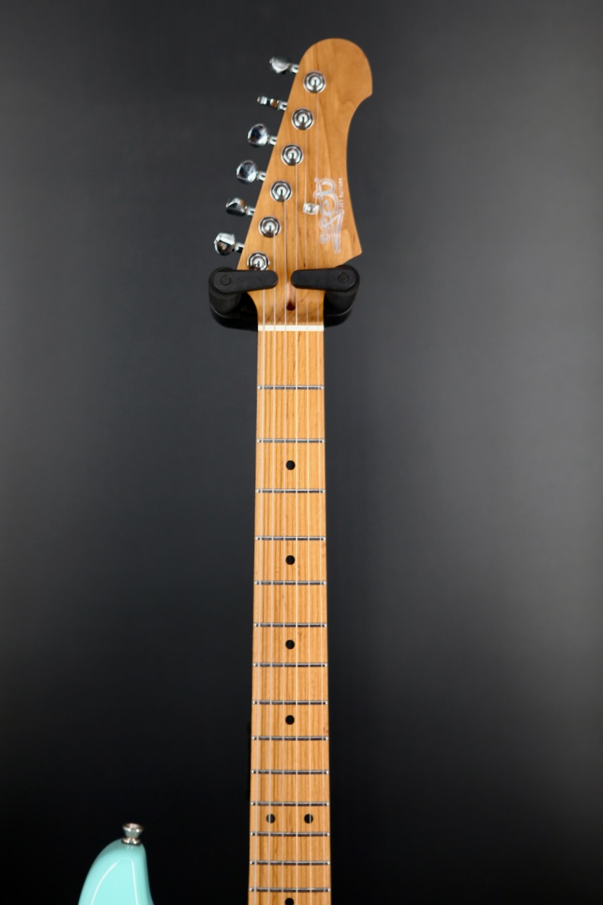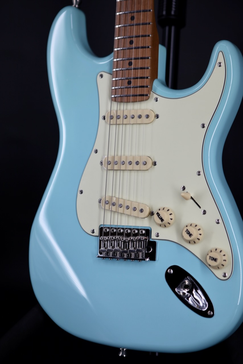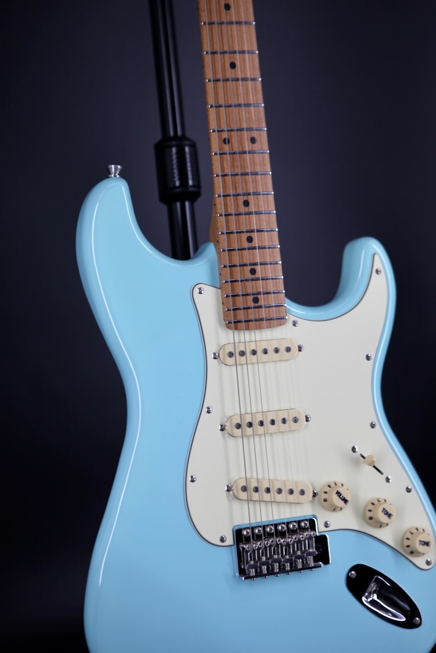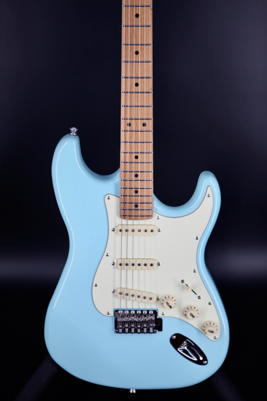 The JS-300 is their version of the world famous S style guitar with three single coil pickups. The guitar boasts features never, ever seen in a guitar at the price, such as a bone nut, roasted Canadian maple neck with a smooth satin finish, a 9.5" radius roasted maple fingerboard, high quality chrome plated hardware including a vintage style tremolo system. Also, they absolutely nail the vintage colours and vibe of the 1950s and 1960s. This particular guitar is in ultra cool Sonic Blue! The tone and playability is outstanding and a perfect guitar for beginners, as well as intermediate or professional players seeking a new sound. There's room for a Jet in everyone's collection!