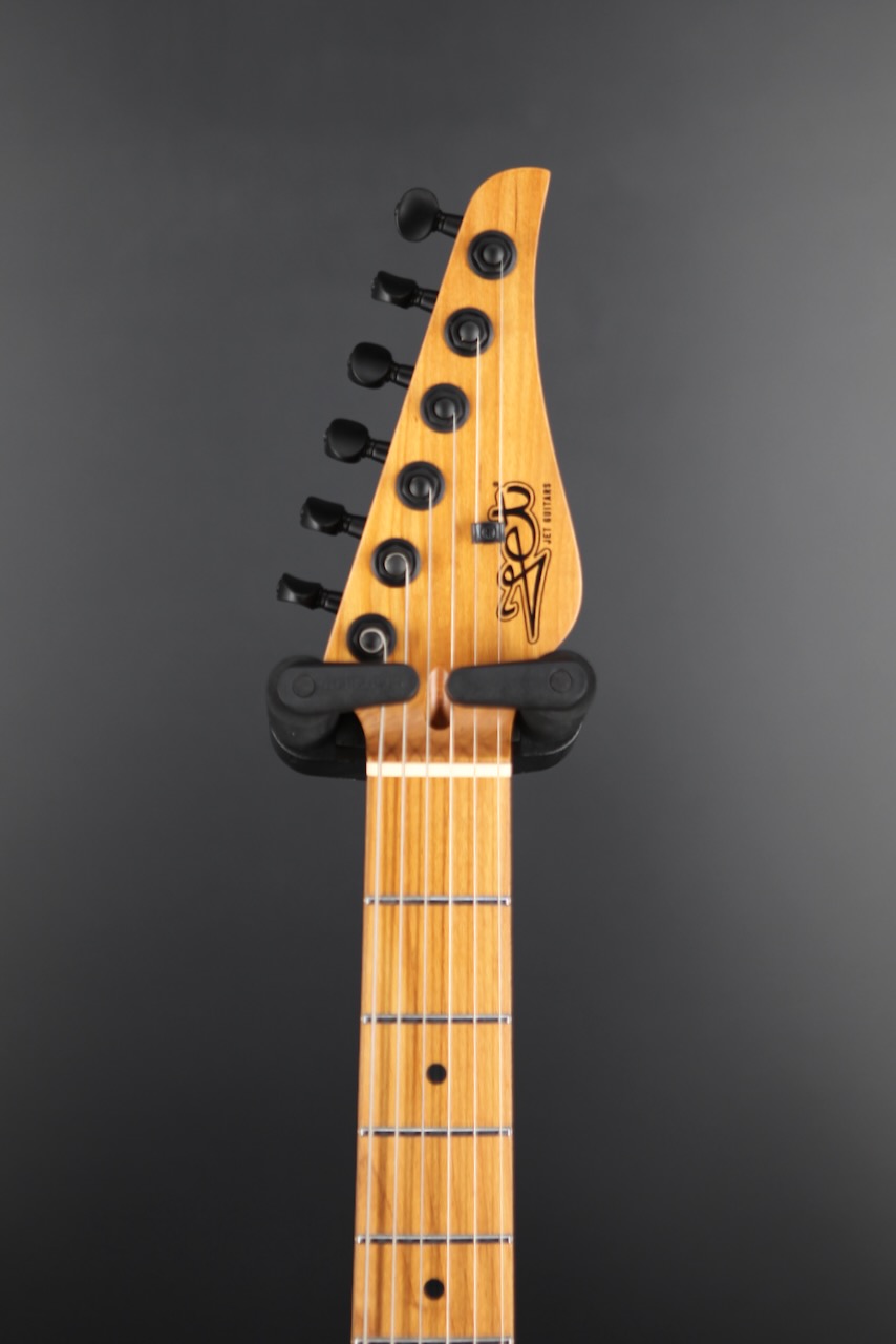 The JET JS-450 Roasted Maple, Blue Burst is a slick, modern S-style built for confident, expressive playing. A roasted poplar body keeps things resonant and lightweight, while the Canadian roasted maple neck with a reversed headstock adds a bold look and a smooth, stable feel. The rosewood fretboard, Modern C profile, and a comfy 9.5" radius make chords, runs, and bends feel effortless across all 22 frets Offering up a range of great tones, dual ceramic humbuckers with brushed black chrome covers bring tight lows and crisp highs, ready for punchy rhythms and soaring leads. A Wilkinson tremolo invites subtle shimmer or wider vibrato, backed up by locking tuners that keep tuning in check. With a simple one volume, one tone layout and a 3-way switch, it's quick to dial in your sound, and that Blue Burst finish with black hardware seals the deal