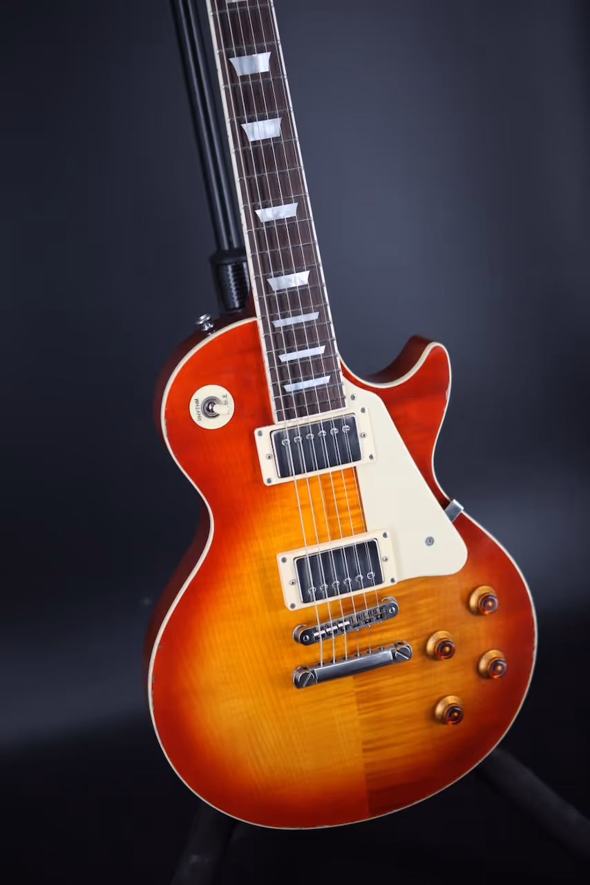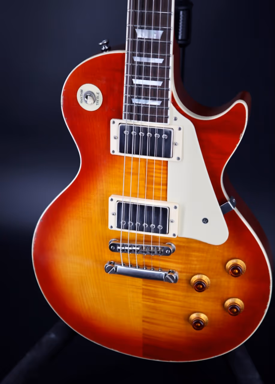 The solid mahogany body paired with a carved maple top creates the classic tonal foundation — rich, resonant, and full of harmonic complexity. Its Cherry Lane nitrocellulose finish glows with deep red hues that fade beautifully toward the edges, perfectly complemented by Maybach’s expert aging process. Subtle lacquer checking, worn edges, and gently dulled hardware make the guitar look and feel like a cherished original from 1958.