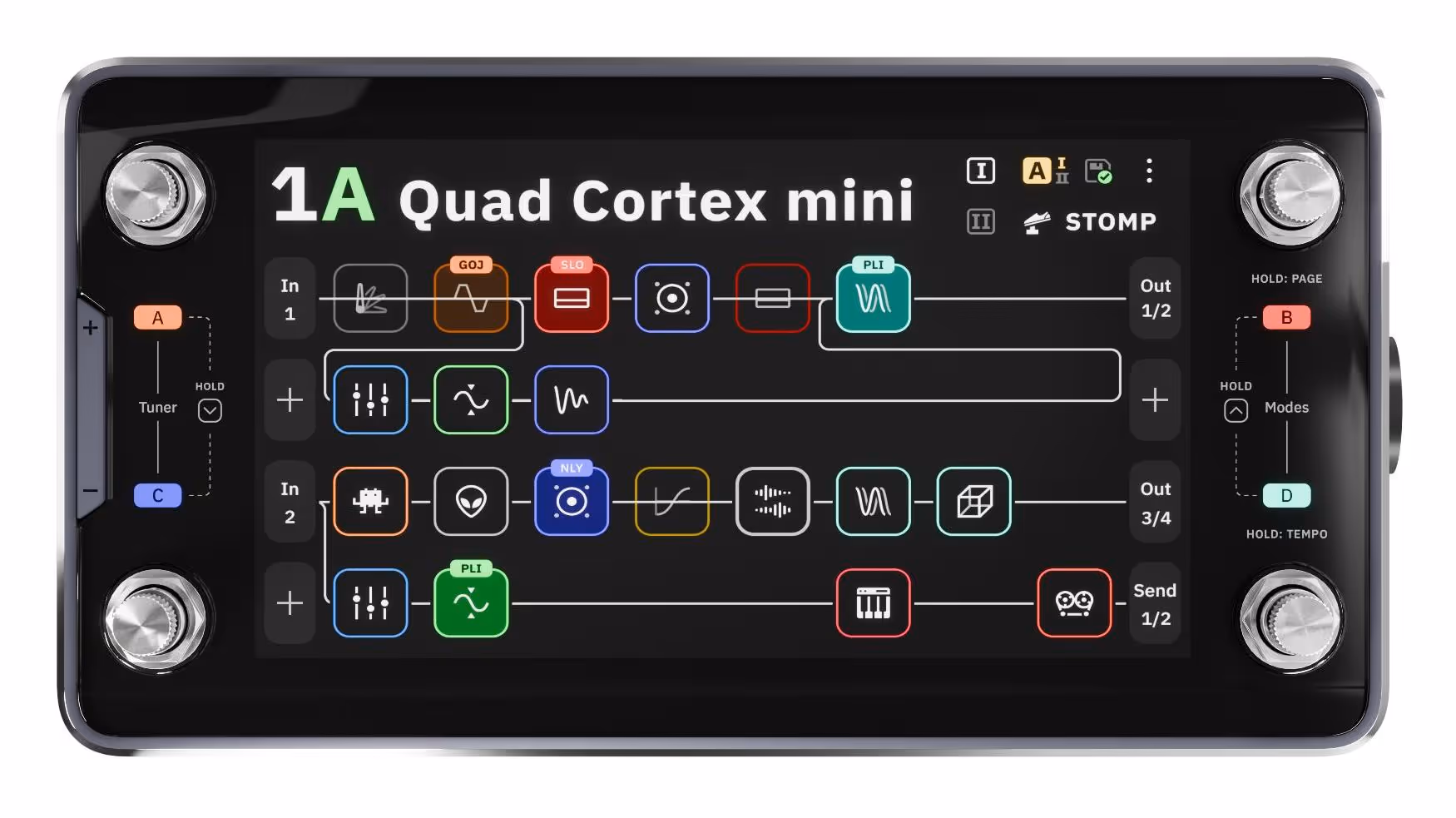 The Nano Cortex features a fixed signal chain consisting of seven device slots, any of which can be bypassed depending on your setup. The pre and post-FX are the same quality on the industry-leading Quad Cortex – yes, it’s that powerful! Here’s what’s in the chain: