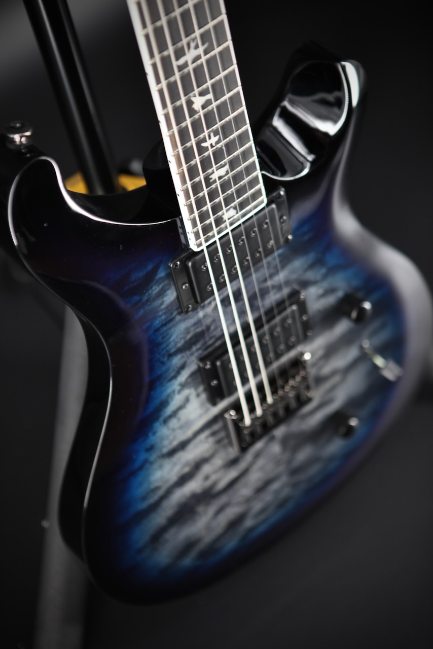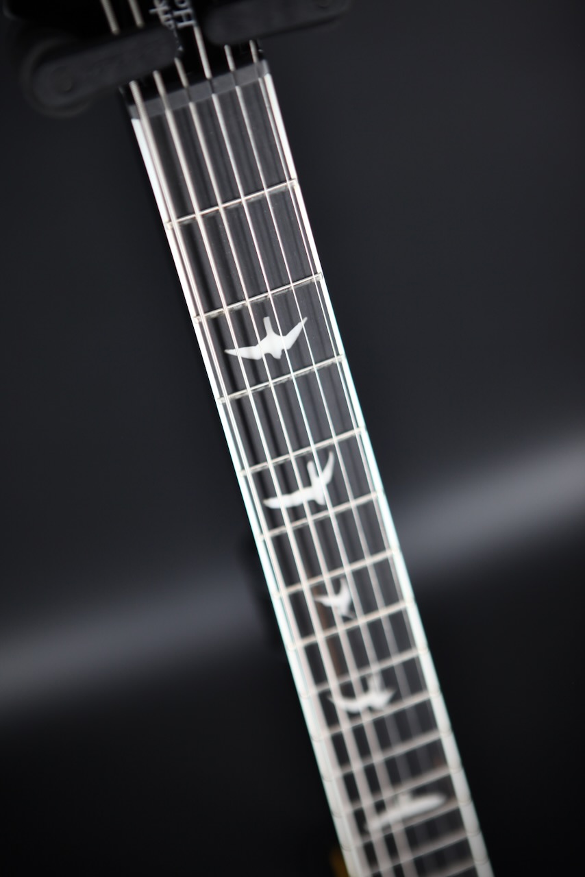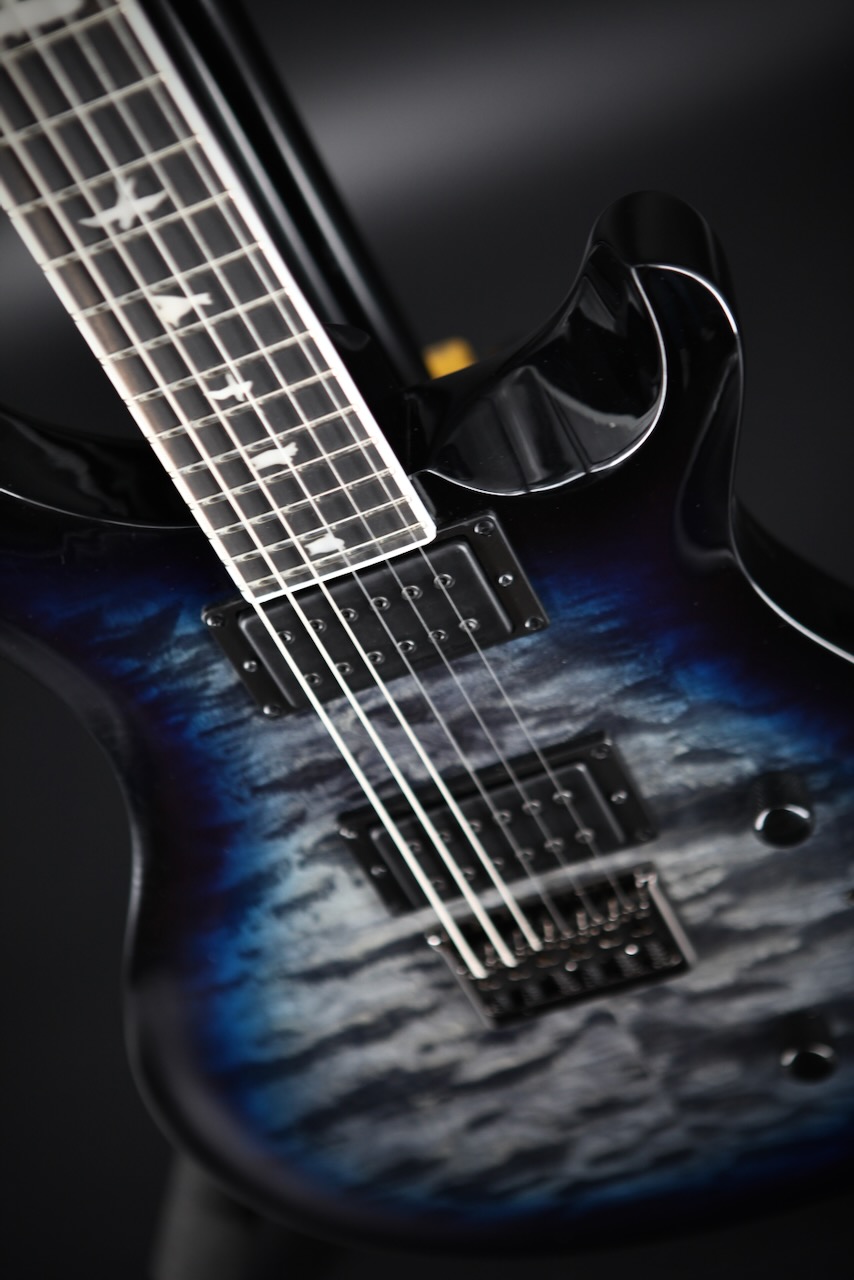 The SE Mark Holcomb model stands on its own in the PRS lineup and delivers addic- tive playability thanks to some unique specifications, including a 24-fret, 25.5” scale length wide thin satin maple neck with 20” radius ebony fretboard. Designed to work with modeling amps in mind, Holcomb’s Scarlet & Scourge pickups bring full tone with slightly less drive, offering more articulation than ever. Whether playing sophisticated chords or melodic leads, in a band or solo, you’ll hear every note. Other specifications include a quilted maple veneer, black chrome hardware, and a 3-way blade pickup switch with push/pull tone knob for coil splitting.