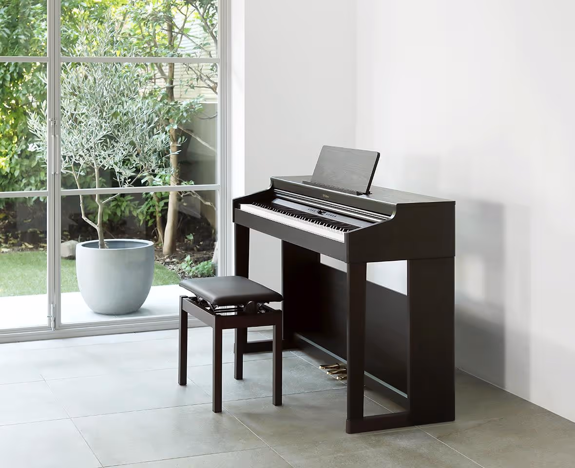 The RP701 brings sophistication to any home with its stylish cabinet design, inspired by Roland’s premium LX and HP series. Featuring classic curves and elegant front legs, it complements a range of interiors. Available in four beautiful finishes – dark rosewood, light oak, white, and contemporary black – it is as visually impressive as it is musically expressive. This refined aesthetic makes it an attractive centrepiece for any living space.