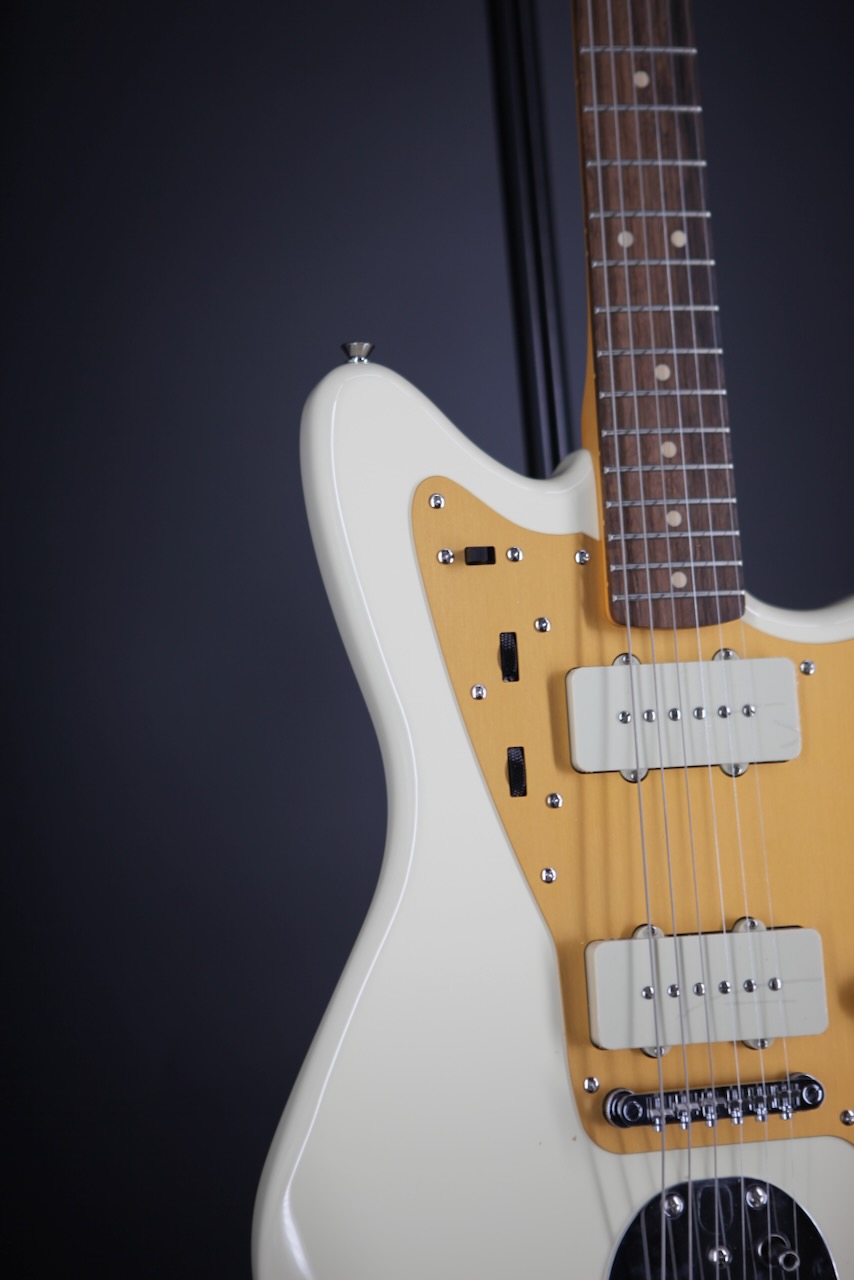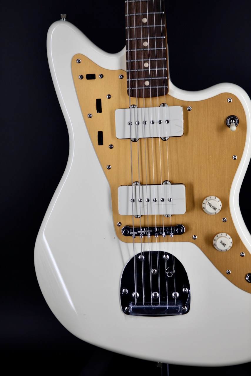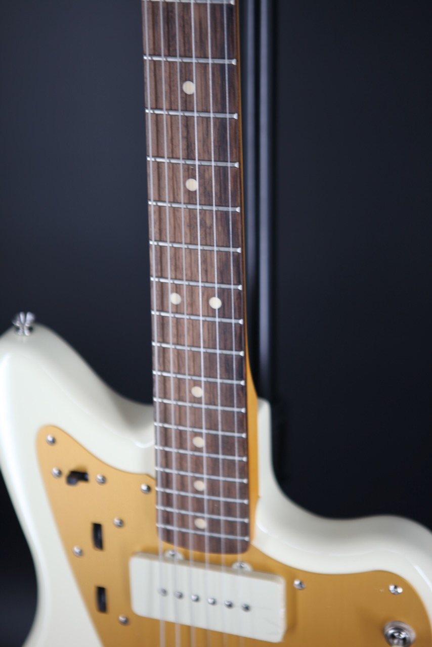 Squier honours alt-rock godfather and Dinosaur Jr. leader J Mascis with a striking Jazzmaster electric guitar model that delivers as much massive sound and performance as its namesake. The pickups, hardware and finish are all specified by Mascis himself for tremendous tone and value. The J Mascis Jazzmaster features a Basswood body, C-shaped Maple neck, Rosewood fingerboard with 9.5" radius and 21 jumbo frets, two single-coil Jazzmaster pickups with three-position switching and dual tone circuits, gold anodized aluminium pickguard, aged white plastic parts (knobs, switch tip, pickup covers), Adjusto-Matic bridge with vintage-style floating tremolo tailpiece, vintage-style tuners, chrome hardware, Vintage White finish and J Mascis signature on the back of the large '60s-style headstock.