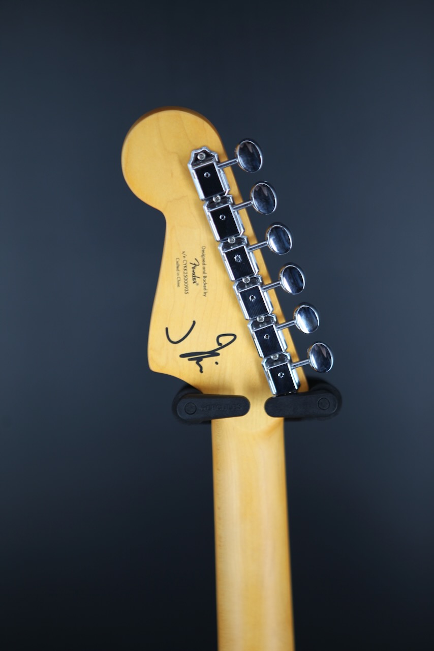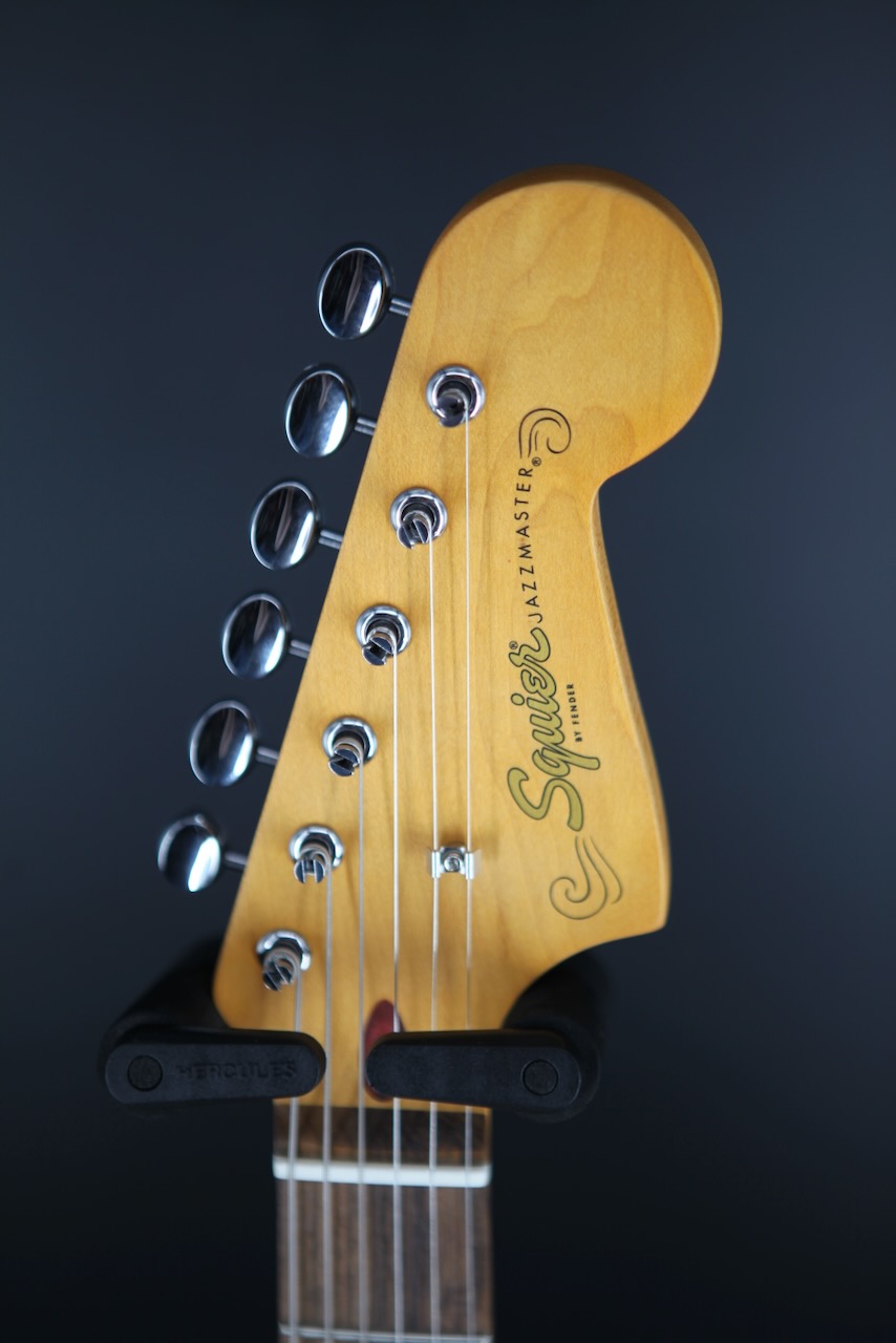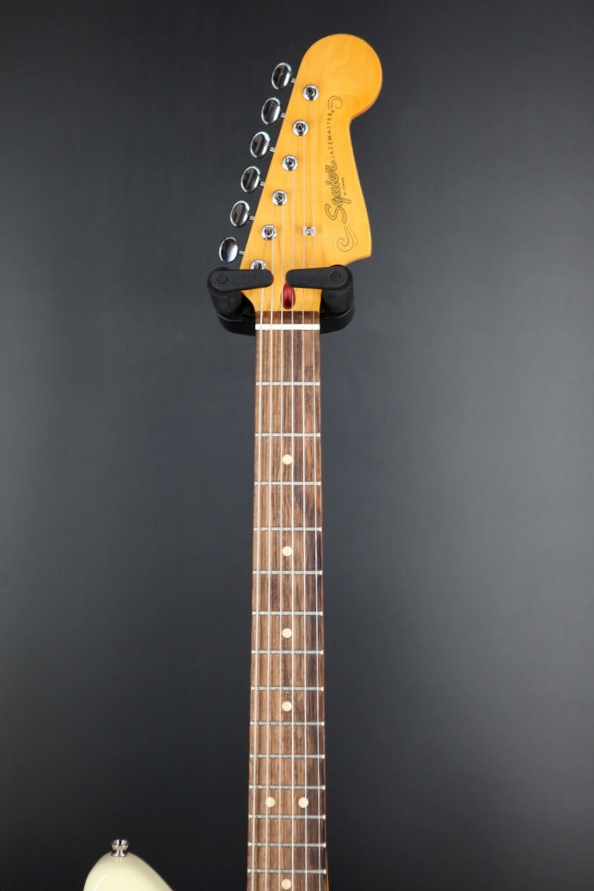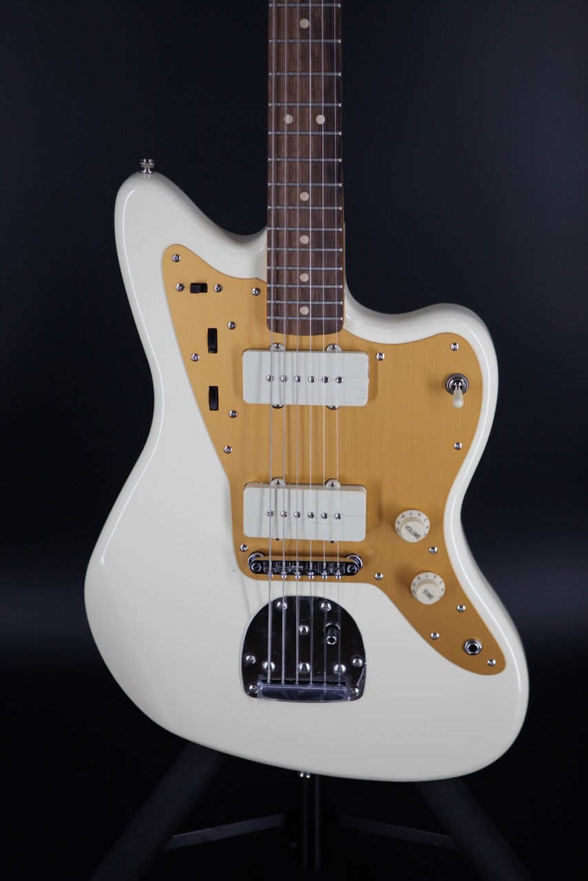 Squier honours alt-rock godfather and Dinosaur Jr. leader J Mascis with a striking Jazzmaster electric guitar model that delivers as much massive sound and performance as its namesake. The pickups, hardware and finish are all specified by Mascis himself for tremendous tone and value. The J Mascis Jazzmaster features a Basswood body, C-shaped Maple neck, Rosewood fingerboard with 9.5" radius and 21 jumbo frets, two single-coil Jazzmaster pickups with three-position switching and dual tone circuits, gold anodized aluminium pickguard, aged white plastic parts (knobs, switch tip, pickup covers), Adjusto-Matic bridge with vintage-style floating tremolo tailpiece, vintage-style tuners, chrome hardware, Vintage White finish and J Mascis signature on the back of the large '60s-style headstock.