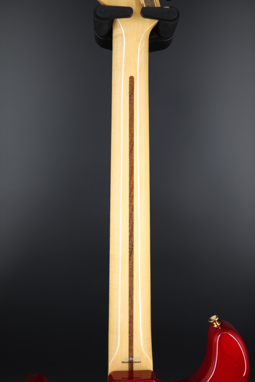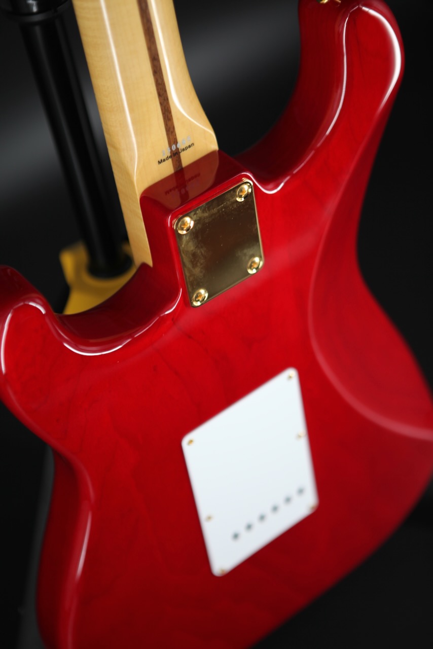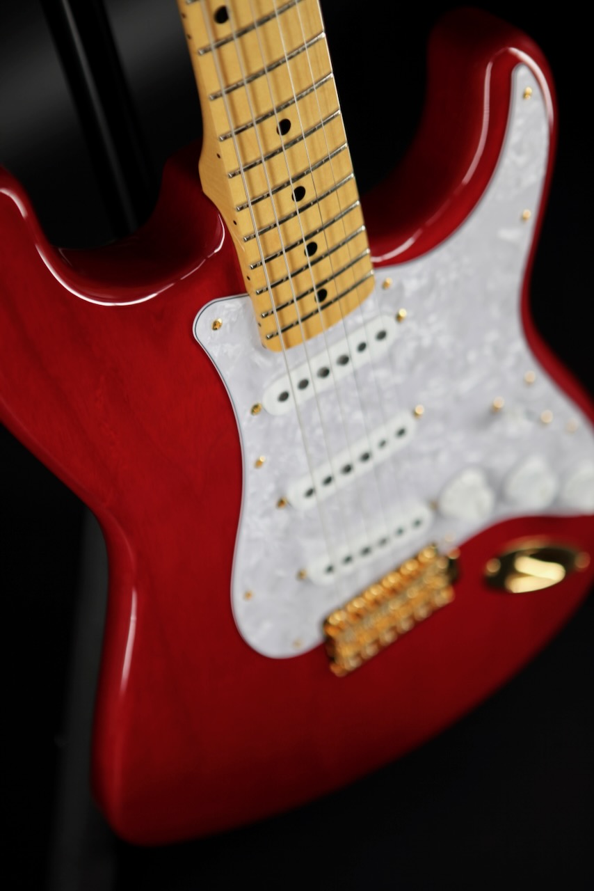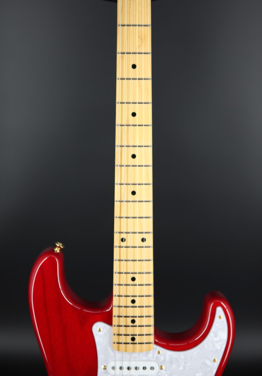 The SR/M designation refers to its See-Through Red finish with a maple fingerboard. The transparent red lacquer allows the ash grain to subtly show through, giving it an elegant, classic look. This model also includes a high-quality tweed hard case.
