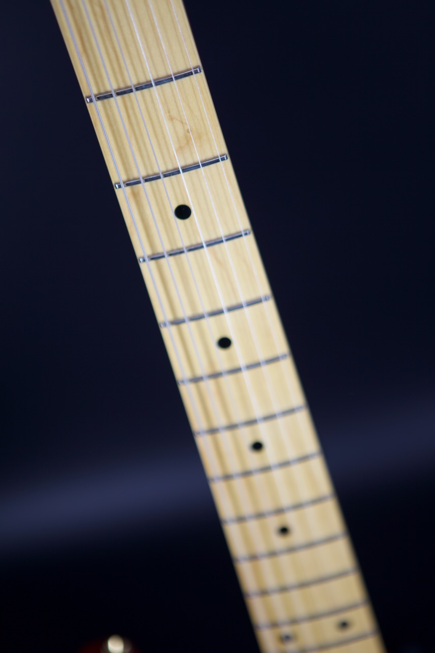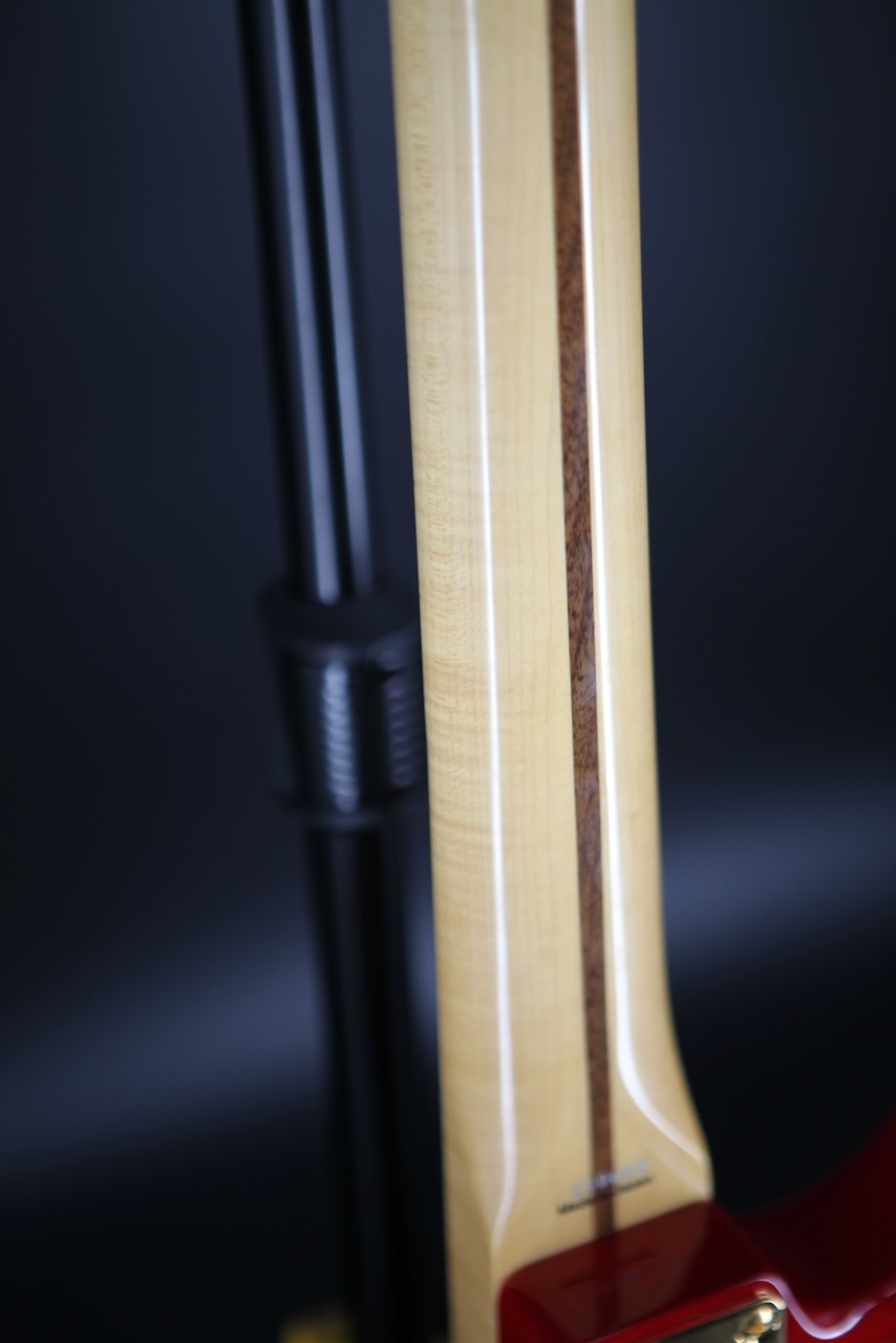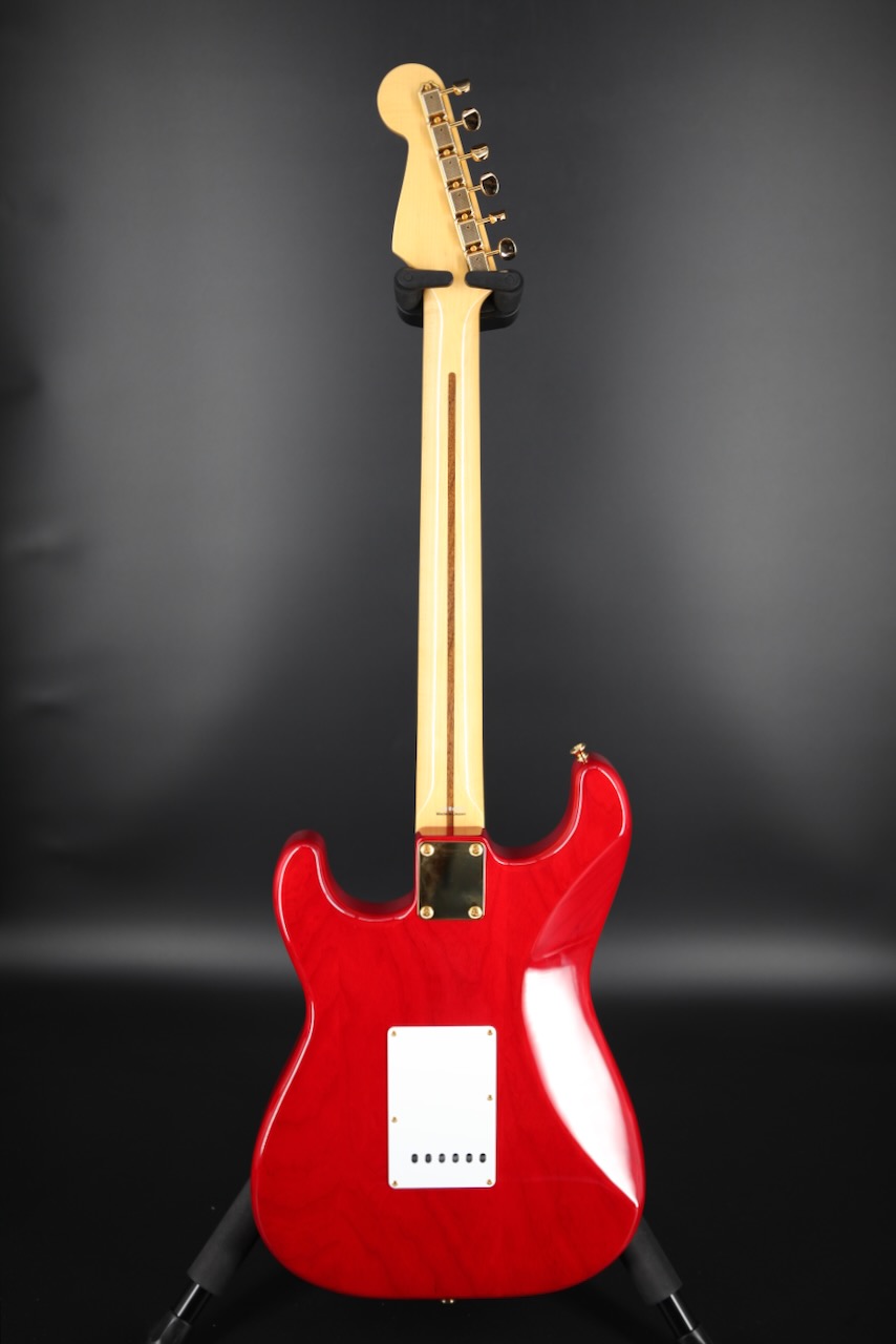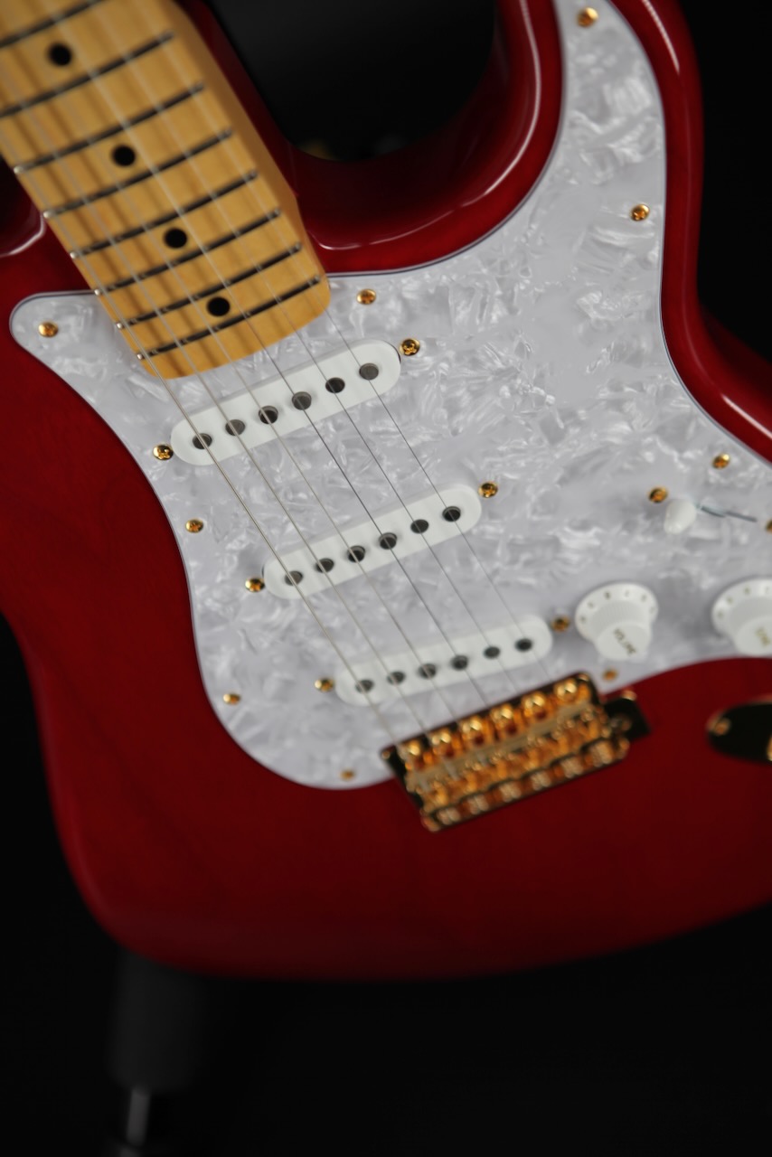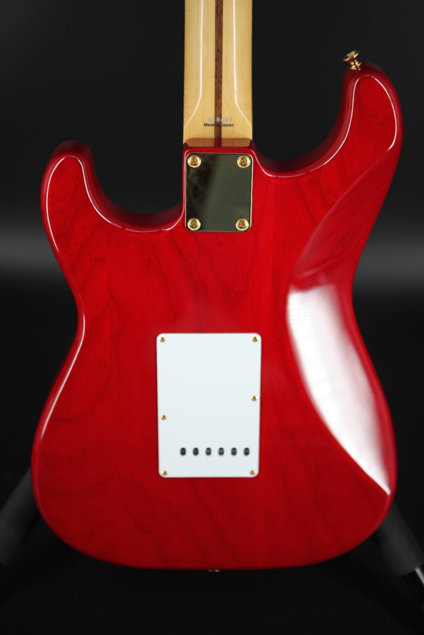 The SR/M designation refers to its See-Through Red finish with a maple fingerboard. The transparent red lacquer allows the ash grain to subtly show through, giving it an elegant, classic look. This model also includes a high-quality tweed hard case.